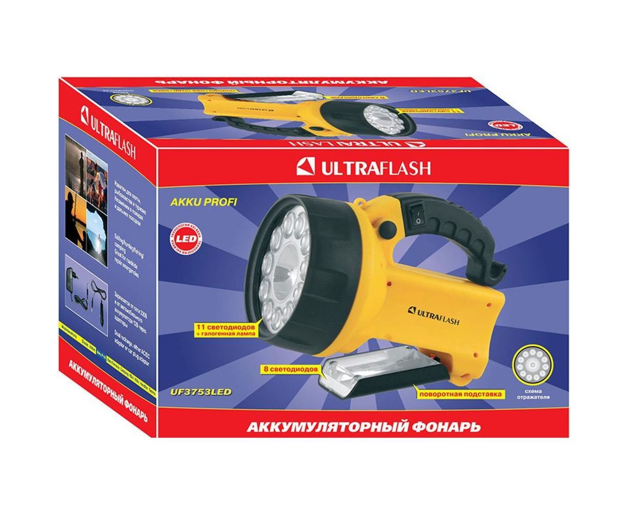 Аккумуляторный фонарь Ultraflash UF3753LED 220В/12В, желтый, 11 LED+ галог, 4В 2Ач, пластик, коробка 8311