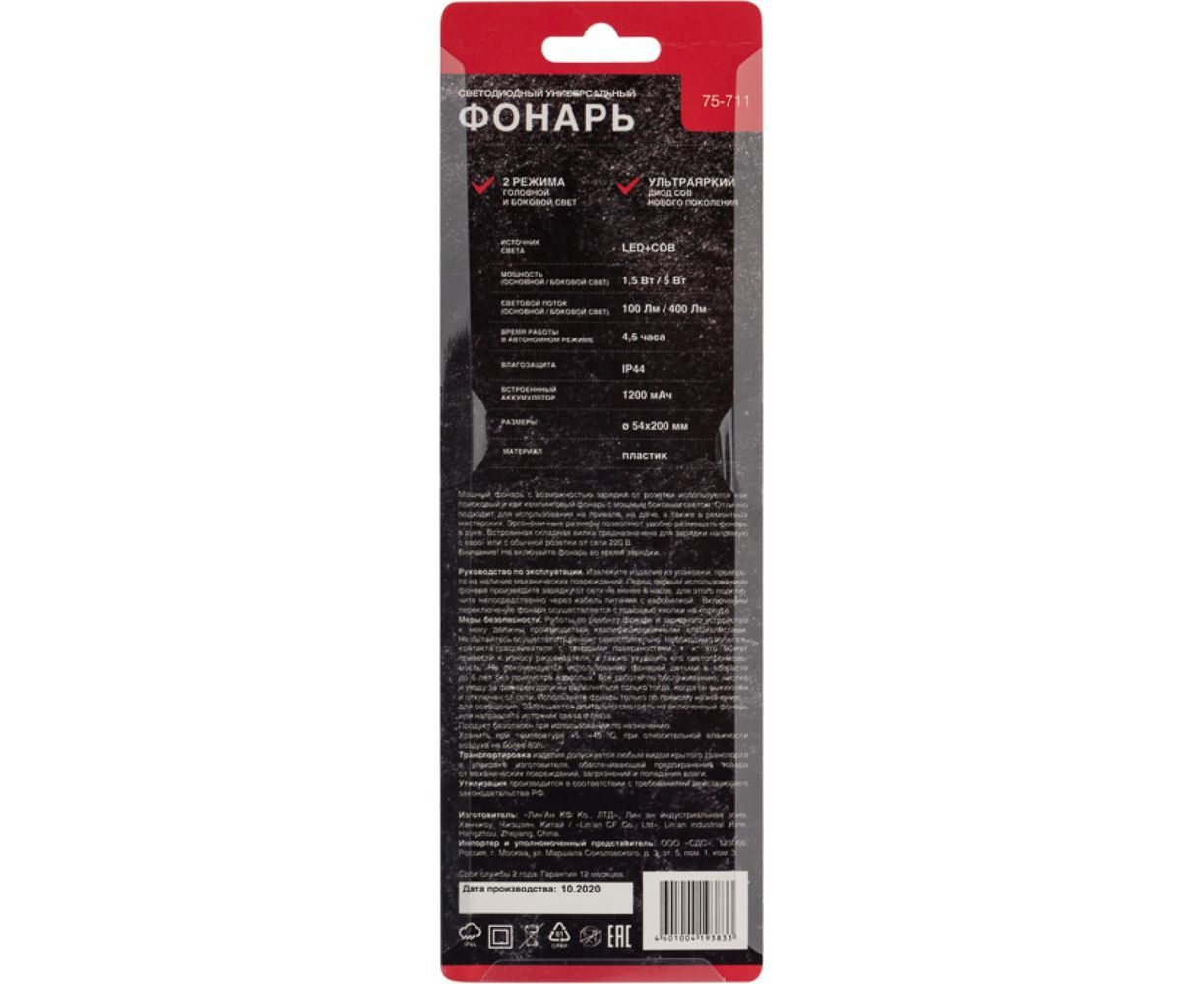 Светодиодный аккумуляторный фонарь REXANT с боковым светом, вилка 220 В 75-711 с возможностью зарядки от розетки используется как поисковый и как кемпинговый фонарь с мощным боковым светом. Отлично подходит для использования на привале, на даче, а также в ремонтных мастерских. Эргономичные размеры позволяют удобно размещать фонарь в руке. Встроенная складная вилка предназначена для зарядки напрямую с евро или с обычной розетки от сети 220 В.