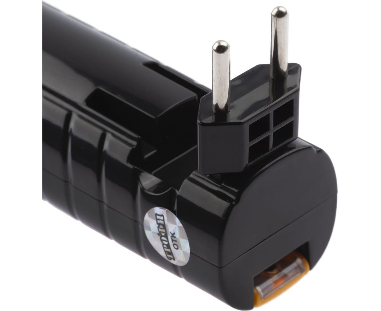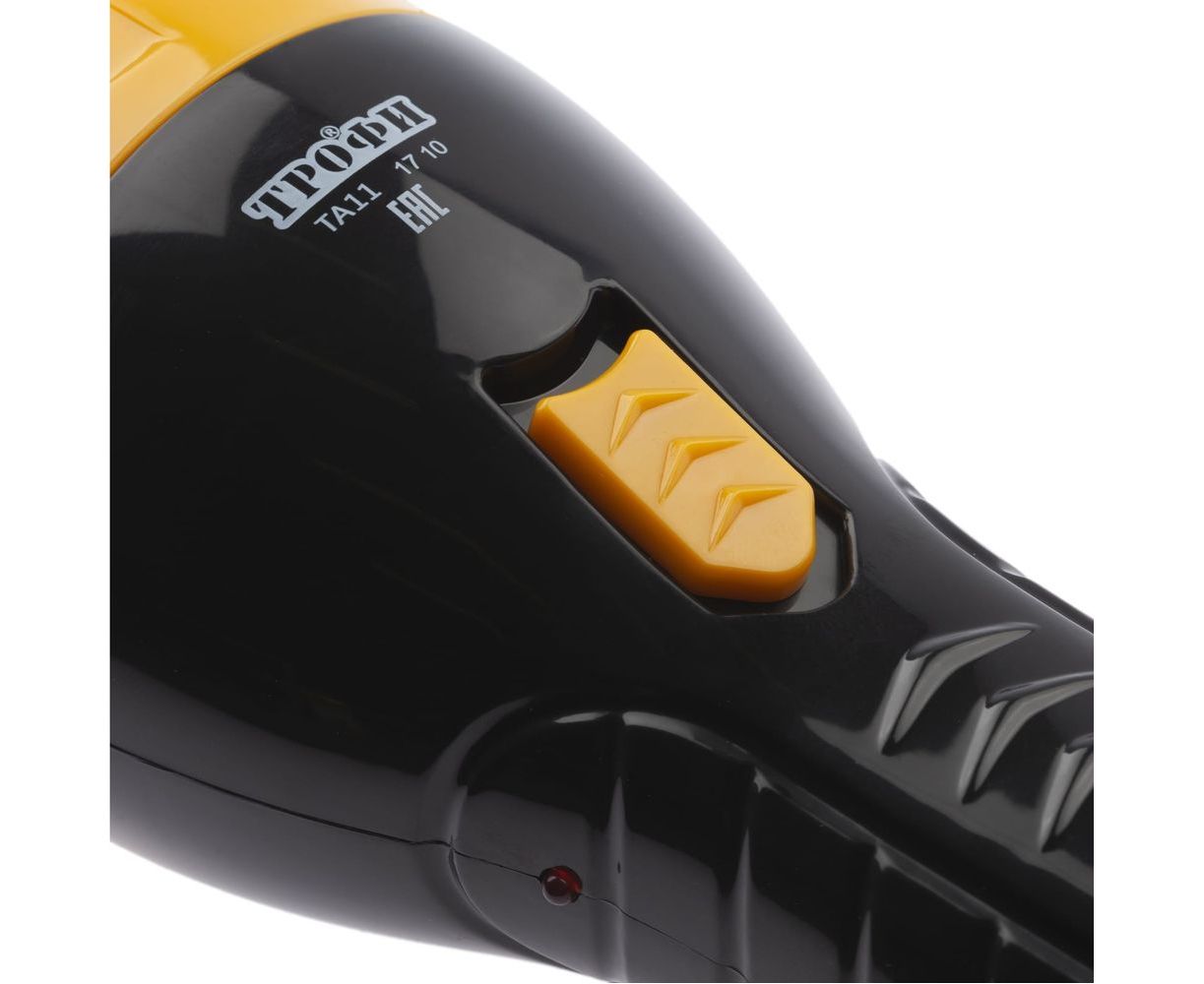 Это удобный фонарь, который избавляет от множества проблем. Больше не нужно обновлять батарейки или носить с собой шнур для подзарядки. Вы приобретаете Трофи ТА11 - и качественный свет всегда рядом. Фонарь подзаряжается от стандартной электрической сети 220 В при помощи евровилки, встроенной прямо в корпус. После заряда вилка легко прячется в специальный кармашек на корпусе. Имеется световой индикатор заряда в виде небольшой красной кнопки. После полной подзарядки Трофи ТА11 проработает в активном режиме 9 полных часов. Установленный в нём аккумулятор имеет высокую для небольшого универсального фонаря ёмкость - 900 мАч. Дальность светового луча характеризуется также отличными показателями - 230 метров.