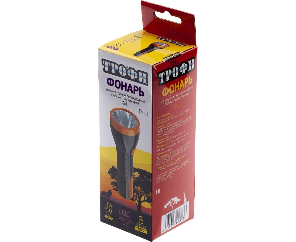 Аккумуляторный фонарь Трофи TA11 4V, 1Ah, 2в1,1Вт, 10SMD, Б0010038 - компактный аккумуляторный светодиодный фонарь с двумя режимами работы и складной евровилкой для удобной подзарядки. Хорошая ёмкость аккумулятора даёт 9 часов активной работы после полного заряда устройства. Высокая дальность светового луча и отличный световой поток. Ударопрочный корпус.