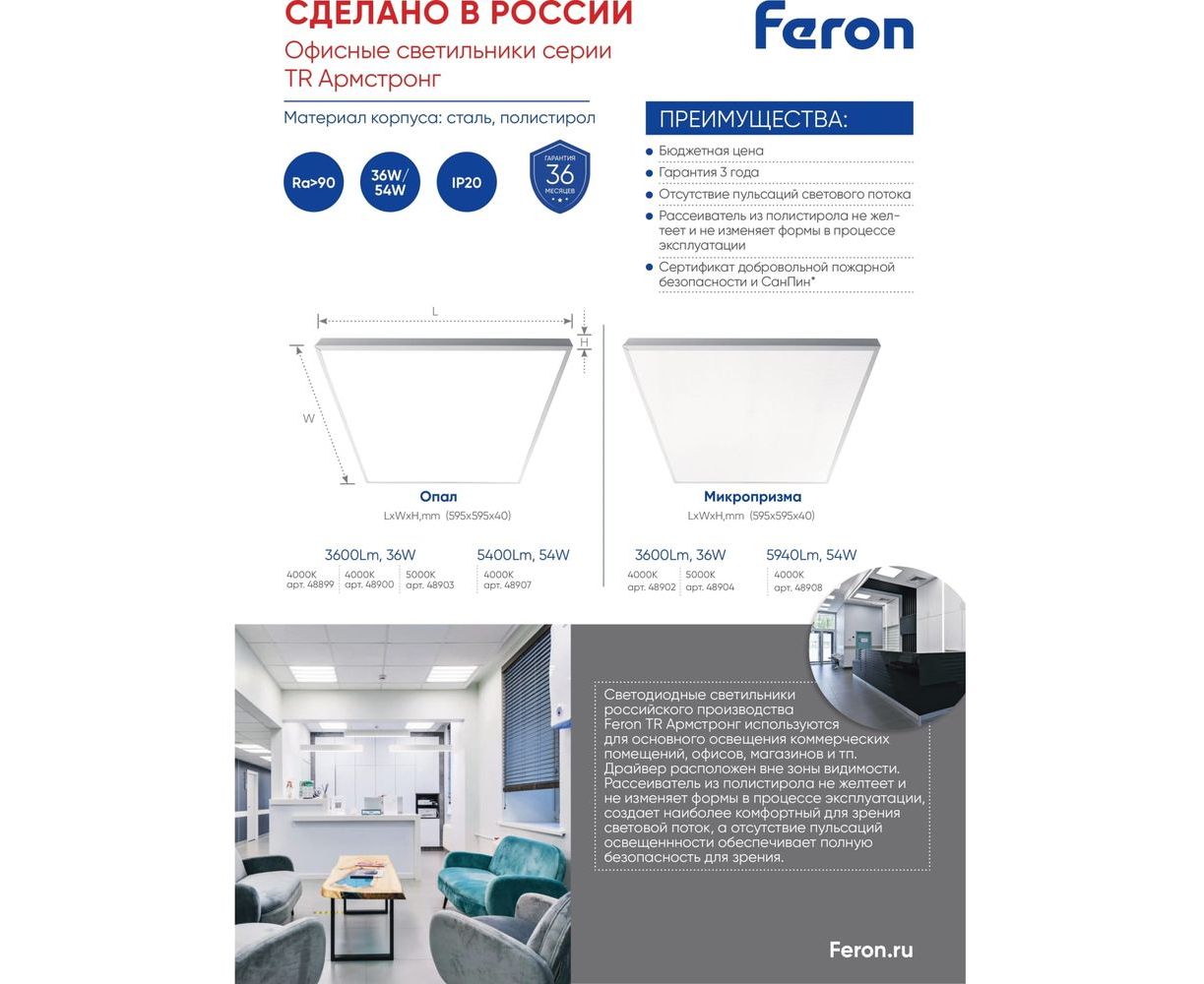 Светодиодные светильники российского производства Feron TR Армстронг используются для основного освещения коммерческих помещений, офисов, магазинов и тп. Драйвер расположен вне зоны видимости. Рассеиватель из полистирола не желтеет и не изменяет формы в процессе эксплуатации, создает наиболее комфортный для зрения световой поток, а отсутствие пульсаций освещенности обеспечивает полную безопасность для зрения.