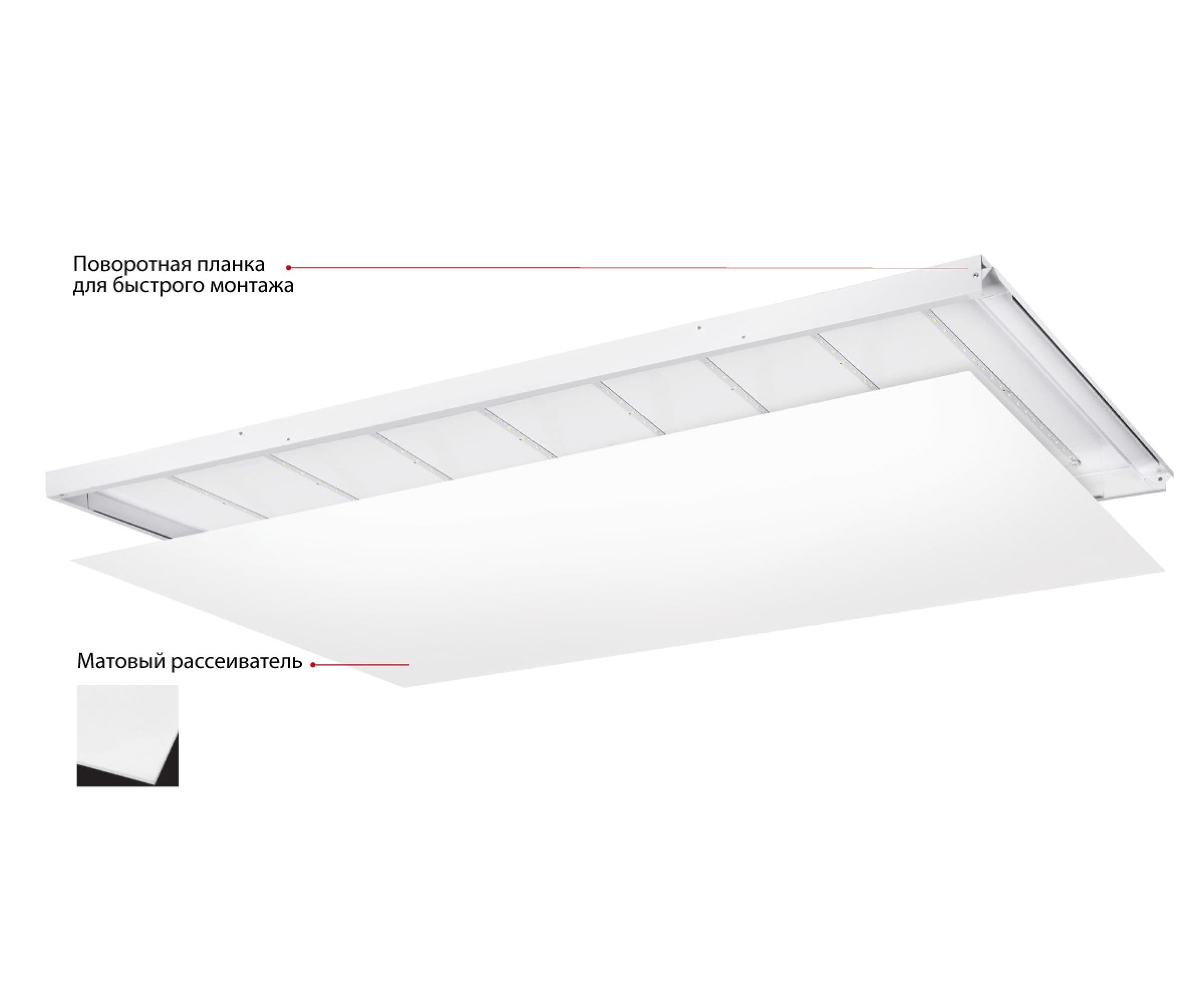Устройство имеет три варианта монтажа: накладной, подвесной и в потолки Армстронг.