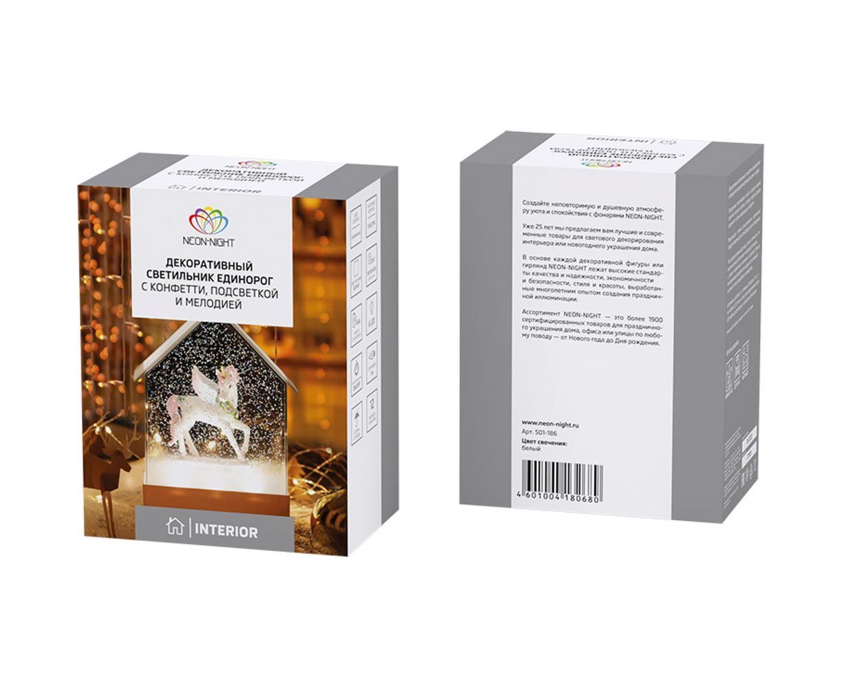 Декоративный светильник NEON-NIGHT Единорог с конфетти и мелодией USB 501-186 с приятным белым свечением придаст уют и привнесет в интерьер тепло, свет и комфорт.
