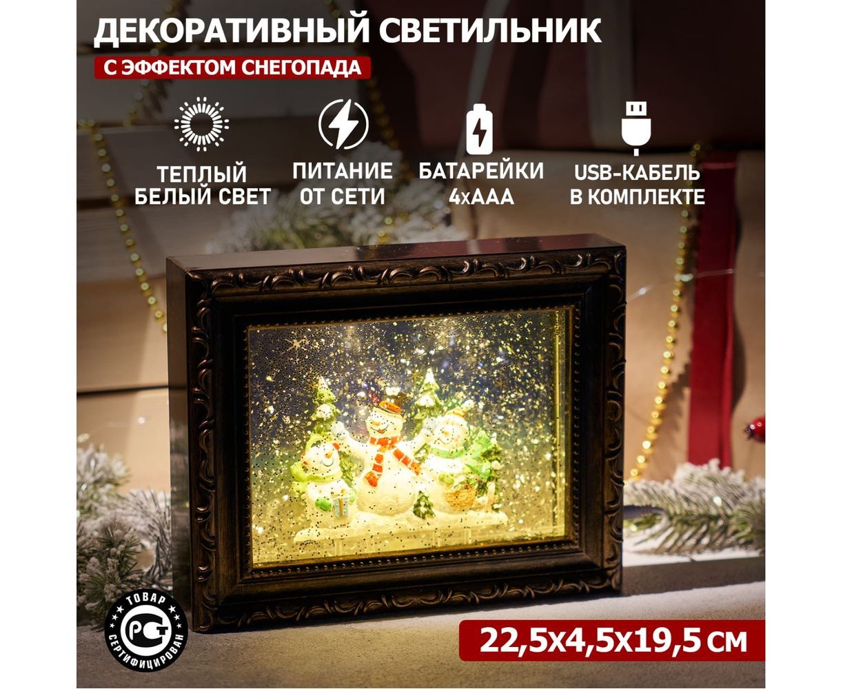 Декоративный светильник NEON-NIGHT Картина с эффектом снегопада 501-163 с эффектом снегопада и подсветкой — прекрасный подарок к Новому году или Рождеству, который порадует и детей, и взрослых. Прозрачная колба наполнена жидкостью с металлизированным конфетти, которая начинает циркулировать сразу после включения. Сверкающий вихрь блесток уносит зрителей в волшебную зимнюю сказку, где главные герои — компания снеговиков — фигурки, стоящие в центре. Светильник работает от 4-х элементов питания типа АА, что дает возможность использования в любом удобном месте. USB-шнур входит в комплект.