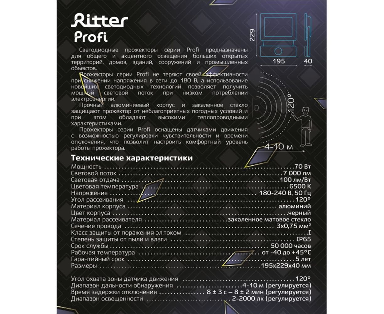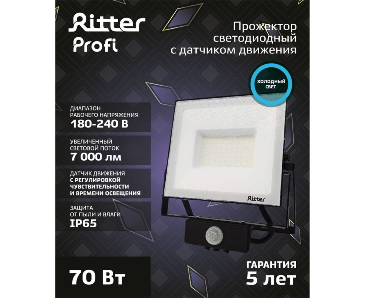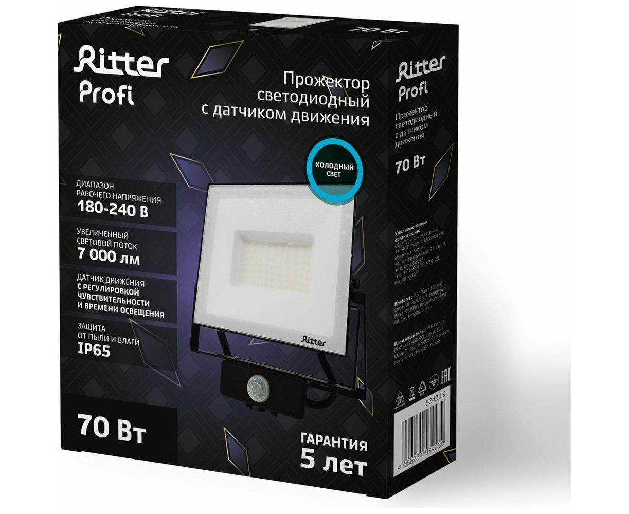 Светодиодный прожектор RITTER серия PROFI 230В 70 Вт 6500К 7000Лм IP65 черный с датчиком движения 53423 9 предназначен для общего и акцентного освещения больших открытых территорий, домов, зданий, сооружений и промышленных объектов.