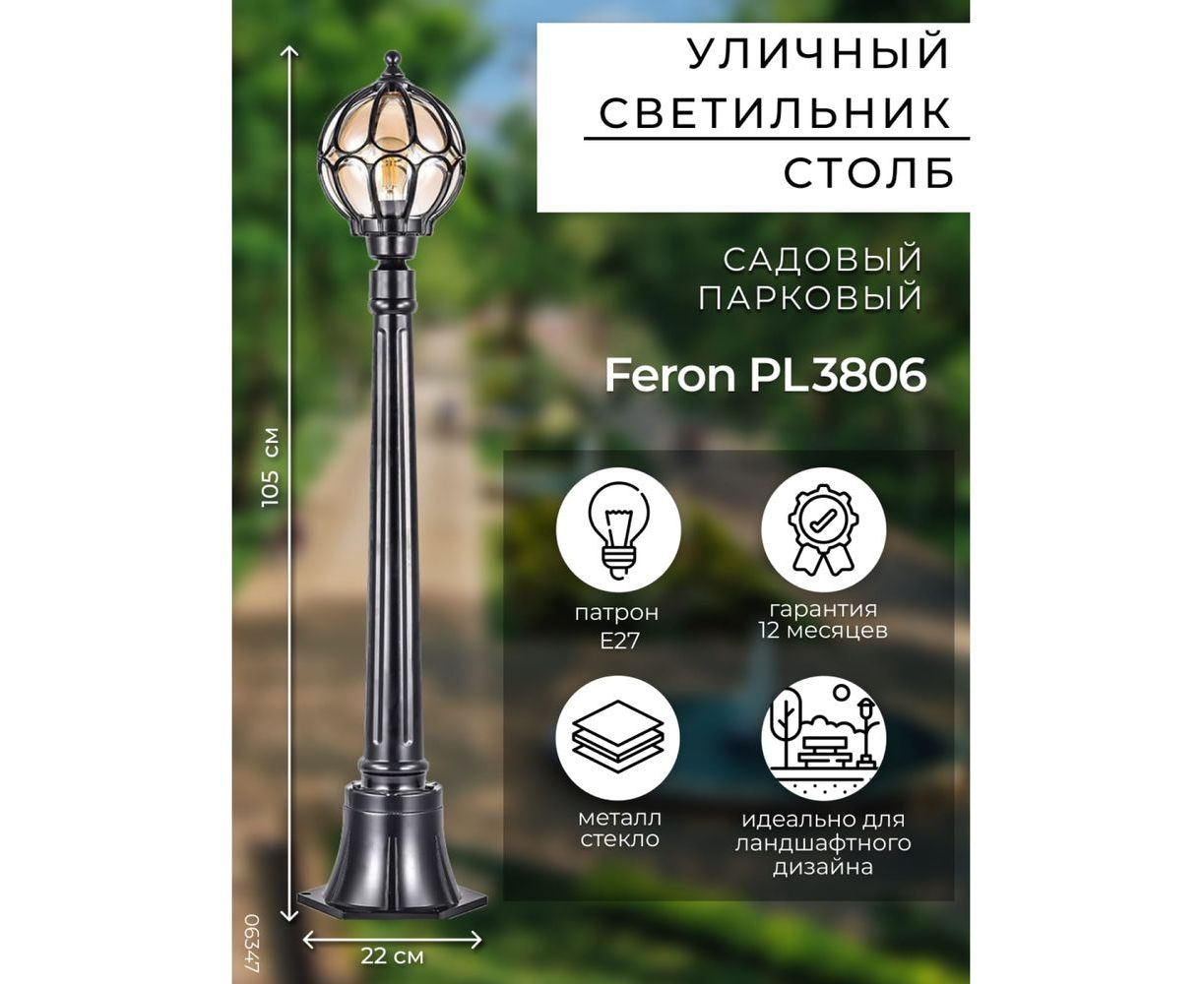 Садово-парковый светильник FERON 60W 230V E27 1.16M черный, IP44, PL3806 6347
