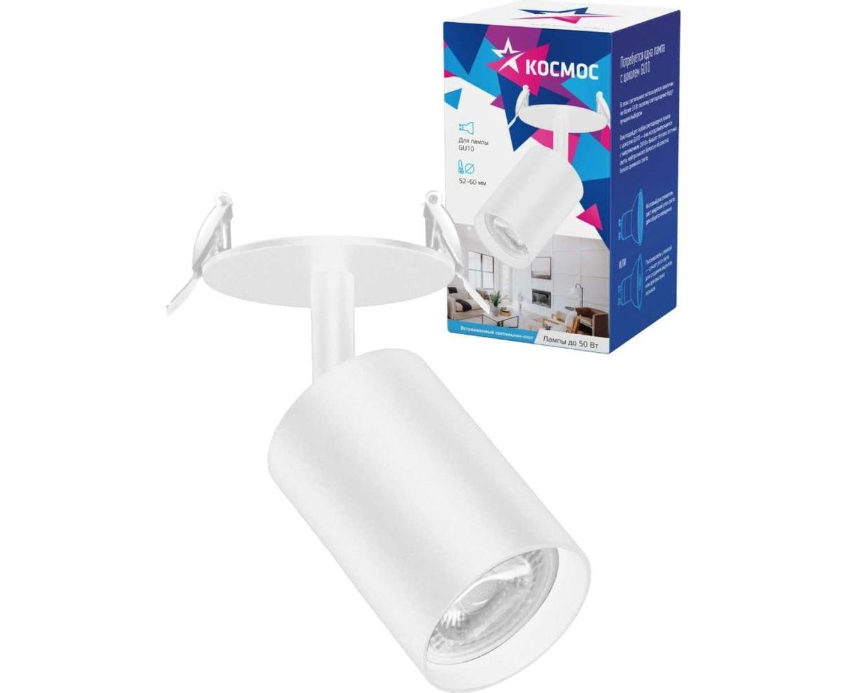 Встраиваемые поворотные споты смогут создать световые акценты в сочетании с основным светом, или могут сами служить основным освещением. Частая проблема схожих моделей с неудобной заменой лампы здесь решена - лампу легко заменить. По яркости оптимально подойдет лампа Космос GU10 10,5 Вт.