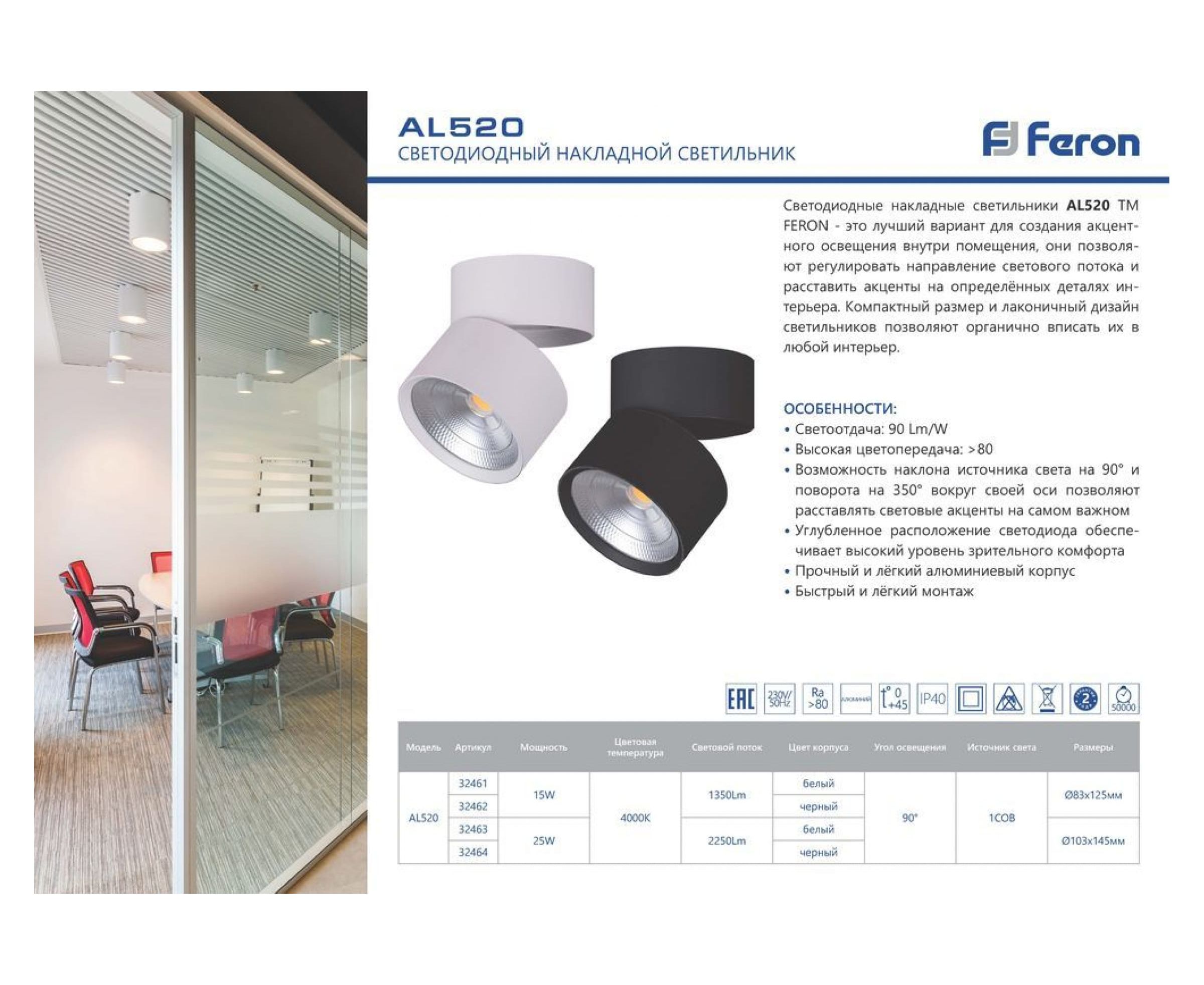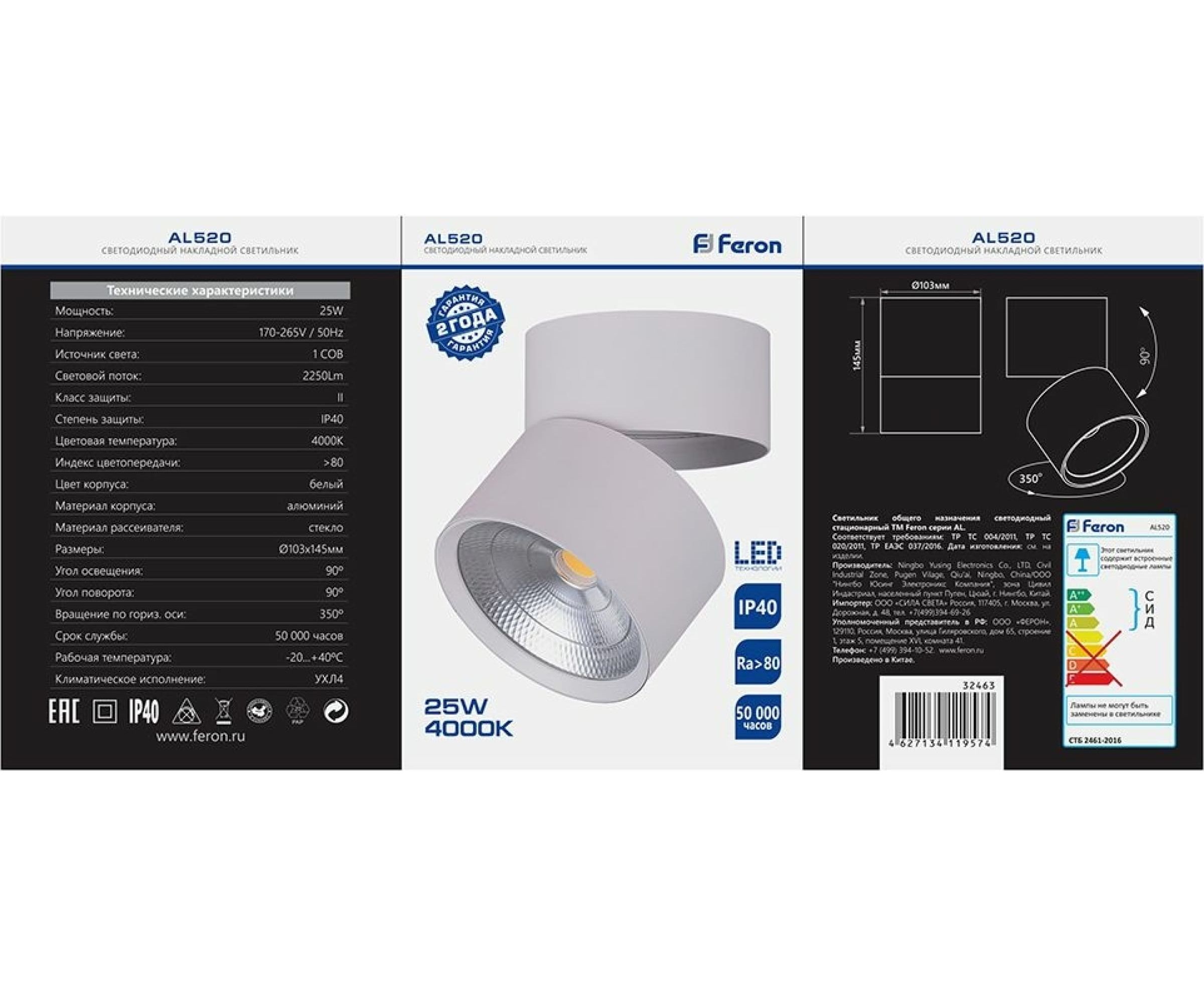 Светодиодный светильник FERON 25W, 2250Lm, 90гр, белый AL520 32463