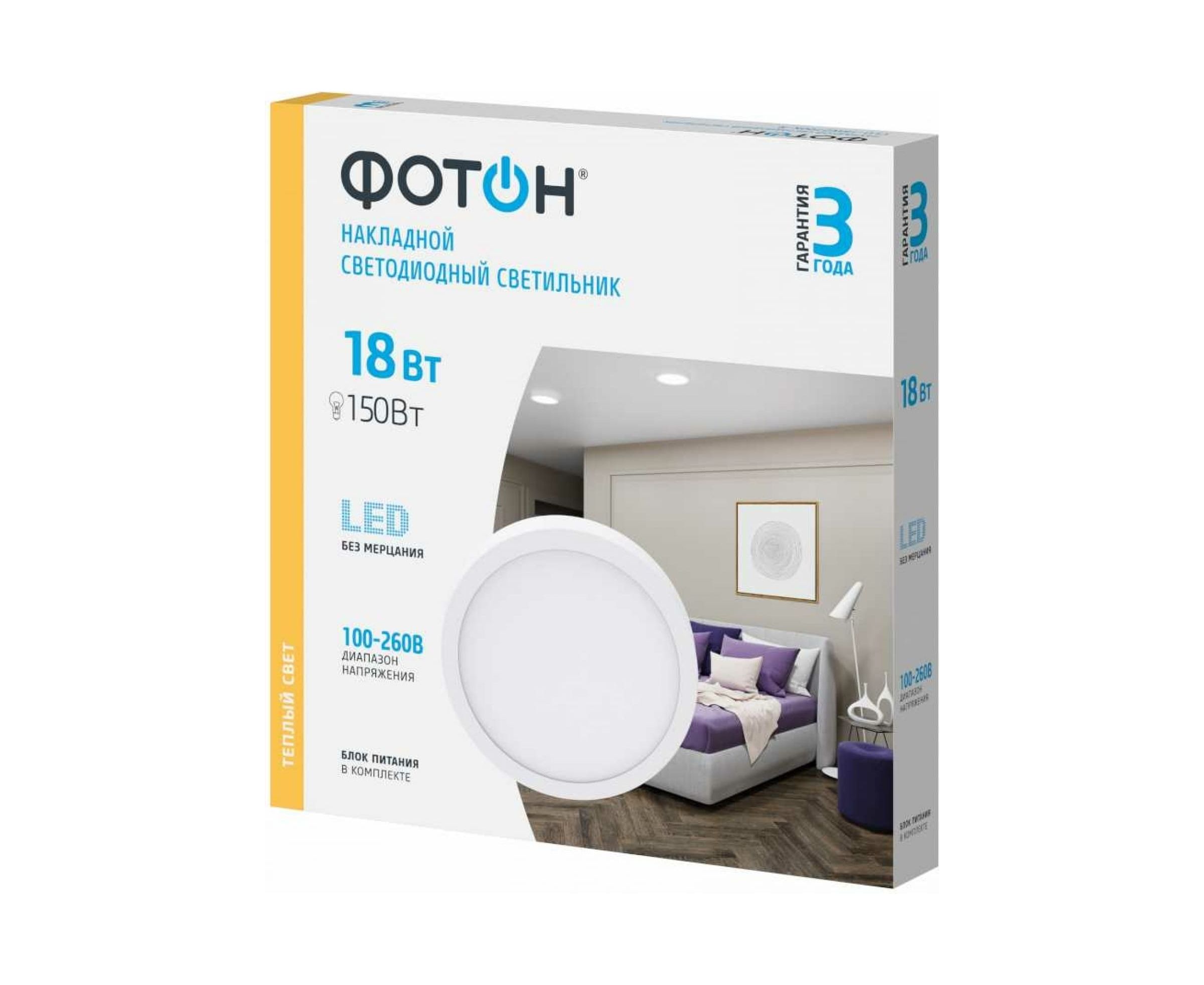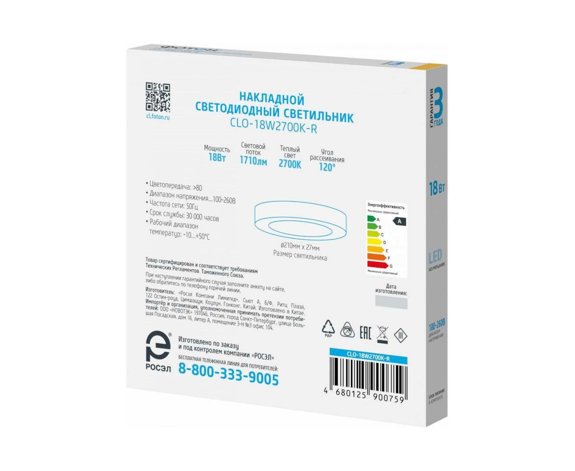 Светодиодный накладной светильник ФОТОН круглый CLO-18W2700K-R 24725 предназначен для общего и акцентного освещения внутри жилых и административных помещений. Широкий диапазон рабочих напряжений. Стабильно ровный световой поток в напряжениях от 100 В до 260 В. Безопасен для зрения и здоровья благодаря низкому уровню пульсации светового потока (менее 5%) в течение всего срока службы.