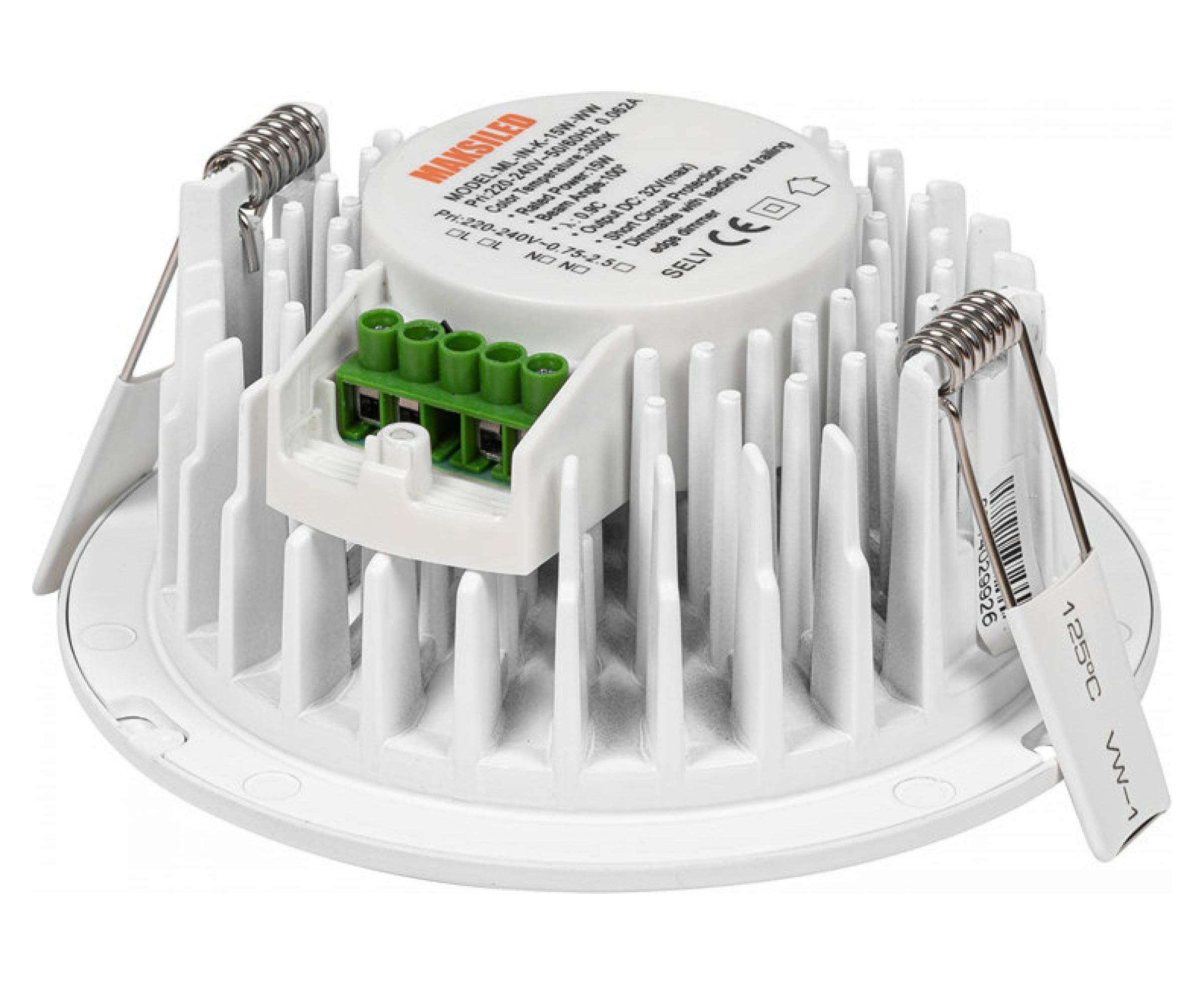 Встраиваемый диммируемый светильник MAKSILED 220 В, 15 Вт, 1000лм, 6000K, ML-IN-K15W-CW с холодным белым цветом свечения и индексом цветопередачи CRI82 обеспечивает равномерное освещение без мерцания и видимости точек светодиодов. Алюминиевый корпус диаметром 120 мм будет гармонично смотреться в любом интерьере. Светильник с широким углом рассеивания 120° и световым потоком 1000 лм обеспечивает качественный свет. Светильник легко устанавливается с помощью пружин в монтажное отверстие диаметром 100 мм.