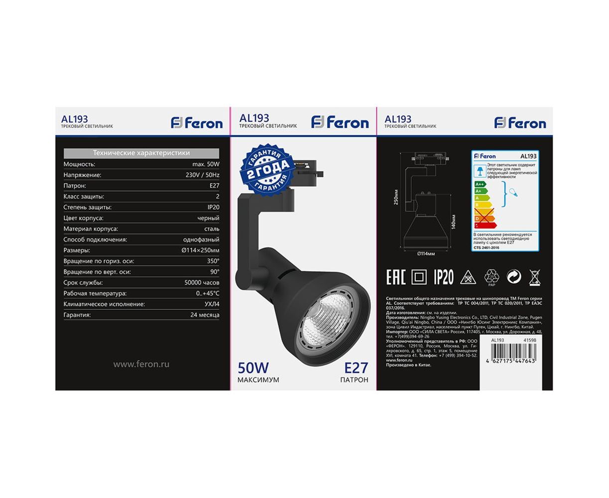 - Трековый однофазный светильник на шинопровод FERON E27, AL193, 50W, 230V, черный 41598 имеет прочный и легкий корпус из стали.