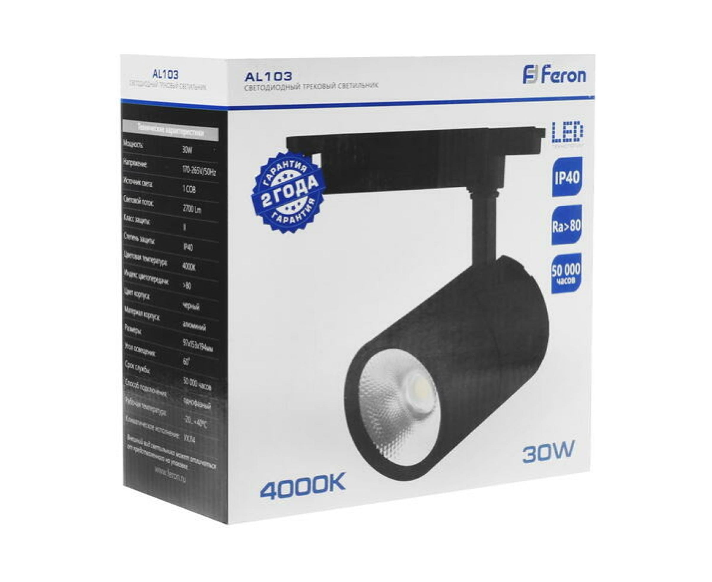Трековый светодиодный светильник на шинопровод FERON 30W, 2400 Lm, 2700К, черный, AL103 32518