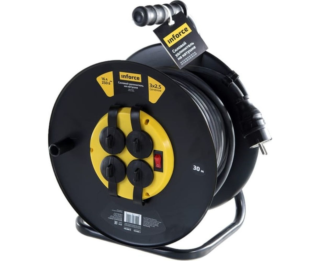 - Катушка удлинителя Inforce 4 гнезда, с/з КГт 3х2,5 16A 30м IP44 09-15-03 выполнена из первичного полипропилена.