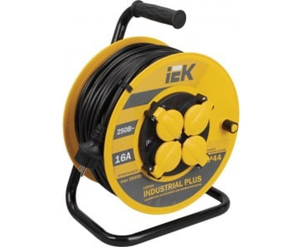 Удлинитель на катушке с термозащитой 4х20м УК20 3х1.5 IP44 IEK Industrial plus WKP15-16-04-20-44 280612 - переносное удлиняющее устройство с четырьмя розеточными гнездами, оснащенными защитными крышками. Удлинитель подходит для использования как внутри помещений, так и снаружи. Позволяет подключать садовую технику, электроинструменты и прочее оборудование суммарной большой мощностью (до 3,5 кВт).