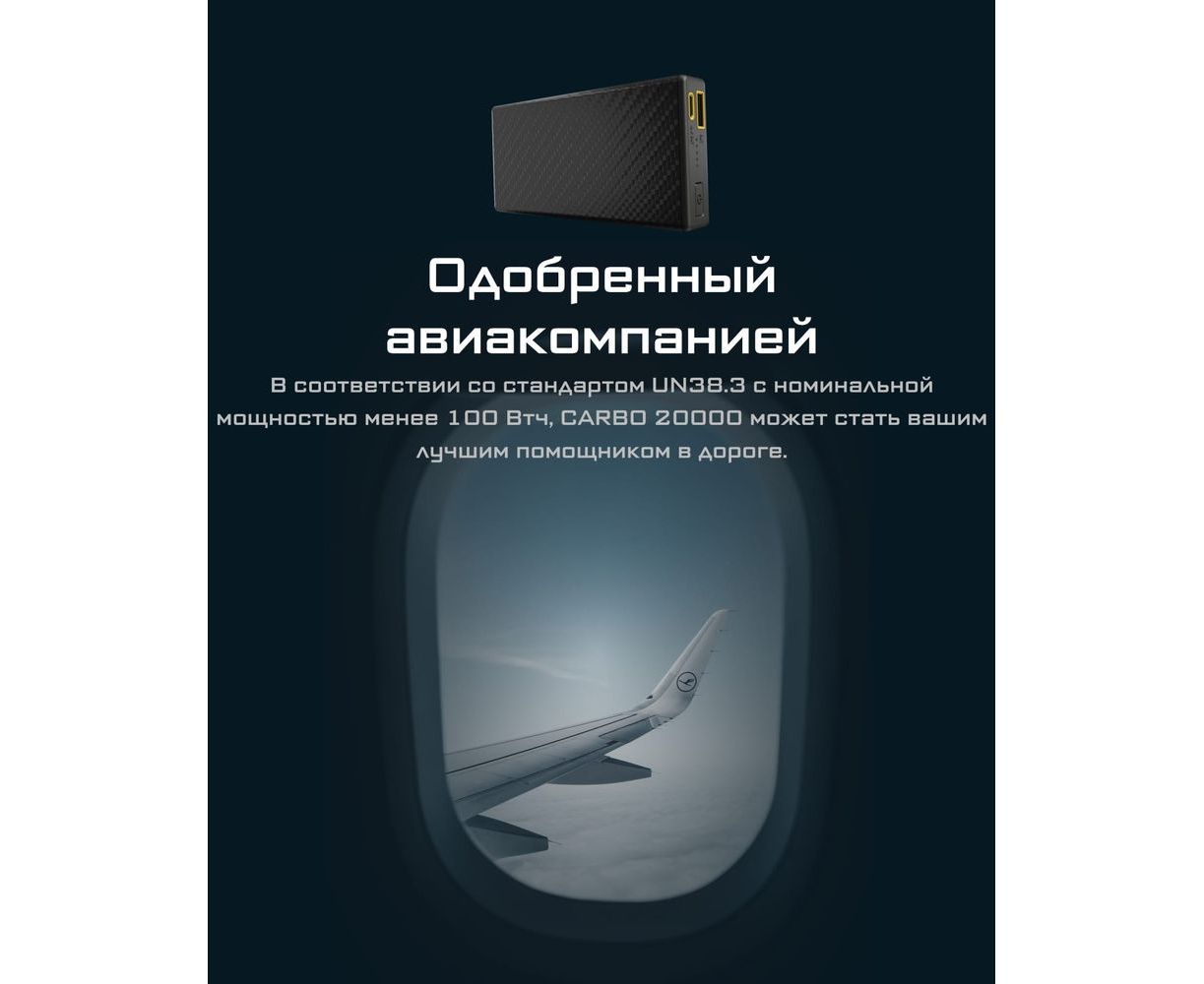 Сверхлегкий power bank CARBO 20000 изготовлен из цельного корпуса для достижения меньшего веса и оптимальной защиты. Используя цельную конструкцию из углеродного волокна без сращивания, CARBO 20000 обладает превосходной ударопрочностью, более чем на 200% большей, чем обычные пауэрбанки.