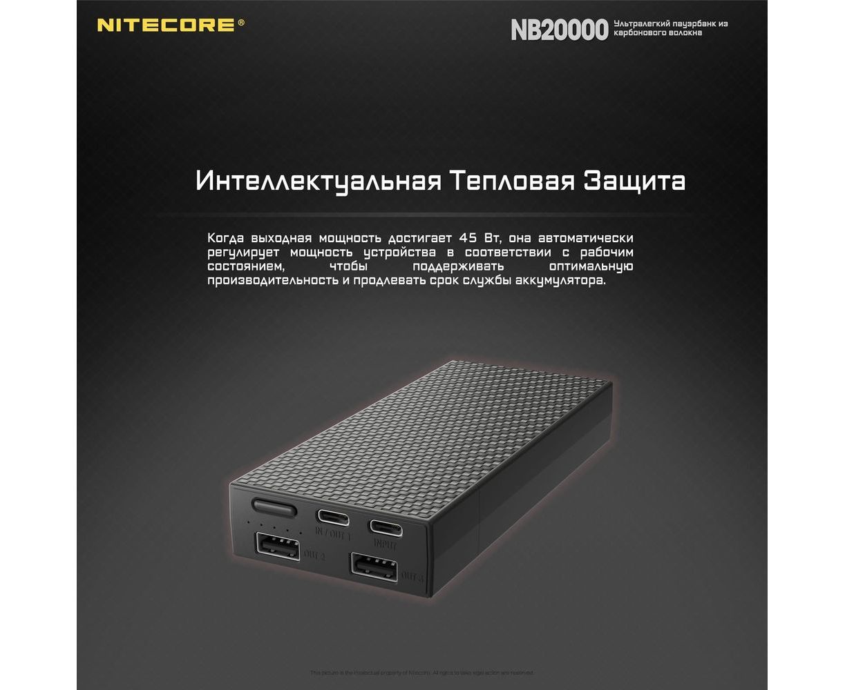 Ультралегкий power bank из углеродного волокна NITECORE NB20000 изготовлен из легкого углеродного волокна и подходит для фото- и видеосъемки, походов, кемпинга и многого другого.