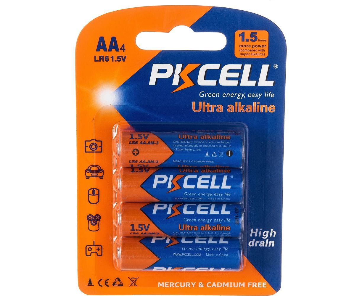Щелочной/алкалиновый элемент питания PKCELL тип - AA 4 шт в блистере LR6-4B - рекомендуется использовать в устройствах со средним и высоким потреблением энергии (плееры, диктофоны, электробритвы, компьютерные мыши, весы, фотоаппараты, фотовспышки, фонари, радиостанции и прочее). Не содержит ртуть и кадмий.