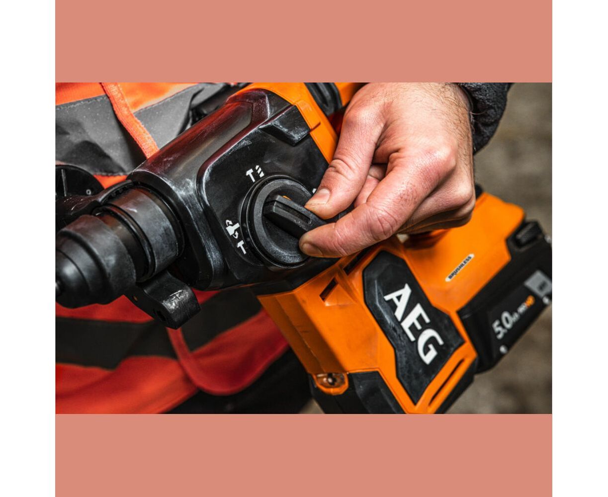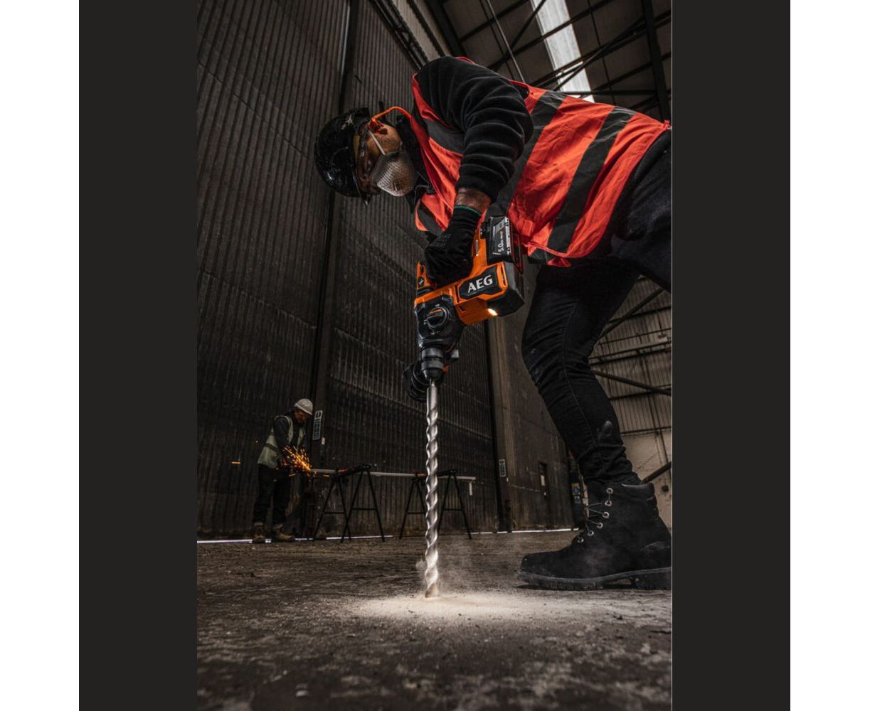 Перфоратор AEG BBH18BL2-0 18В 4935480697 подходит для сверления отверстий в бетоне диаметром до 26 мм, дереве и стали. Имеет 3 режима: сверление, сверление с ударом, долбление + предустановка долота.