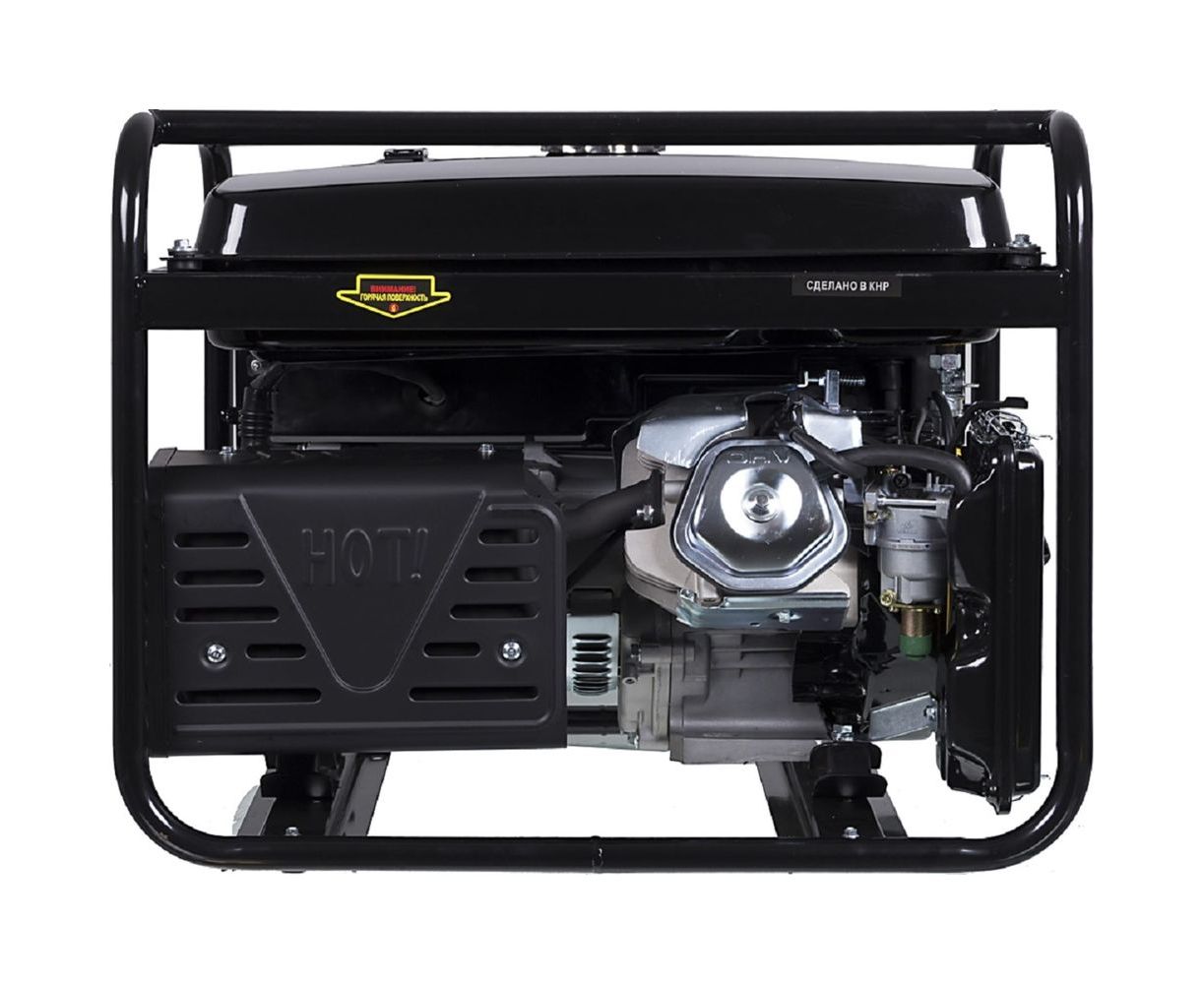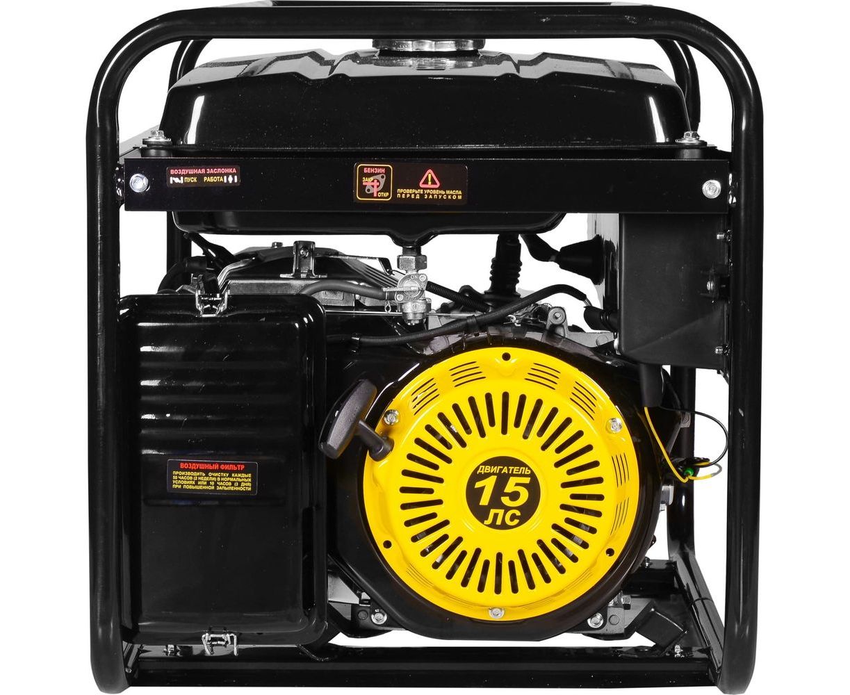 Генератор оснащен 4Т одноцилиндровым двигателем с воздушным охлаждением мощностью 15 л. с. В качестве топлива используется бензин АИ-92, вместительность бака составляет 25 л. Включение агрегата производится вручную. Модель оснащена системой стабилизации рабочего тока. Это позволяет бензогенератору формировать чистую синусоиду, необходимую для безопасной работы компьютеров, климатической и другой чувствительной к перепадам напряжения техники. В случае короткого замыкания, критически низкого уровня масла, перегрузки, перегрева срабатывает система защиты, агрегат автоматически отключается. В комплектации предусмотрено наличие ключа с воротком для замены свечи, штепселей для подключения, амортизирующих опор для снижения вибраций. Электростанция поставляется в открытом исполнении на раме. Для более комфортного перемещения раму можно доукомплектовать колесами.