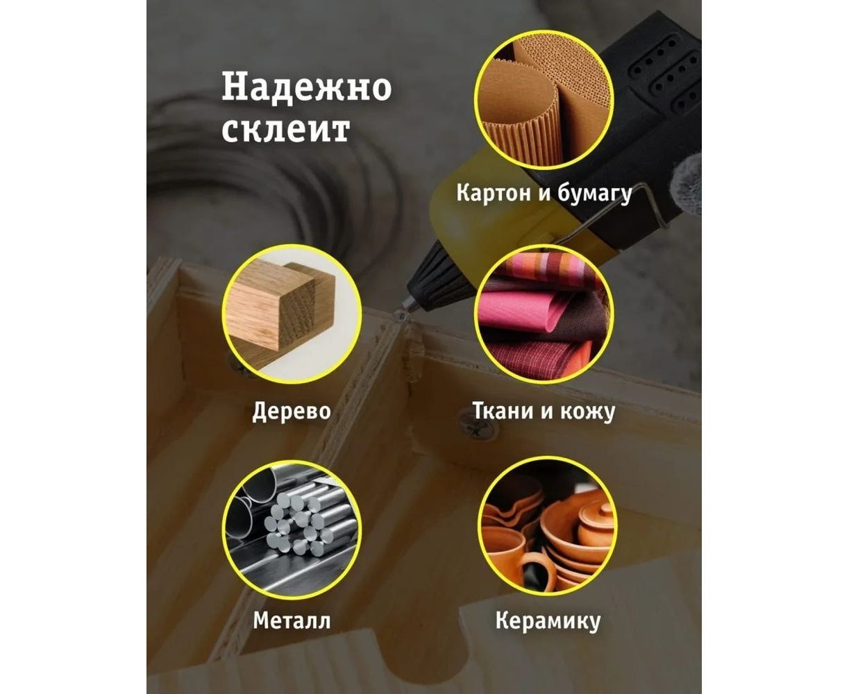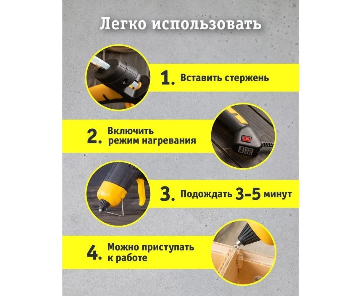 Пистолет имеет длинный кабель – 1.5 метра, а также устойчивую подставку и индикаторную кнопку включения и выключения. Специальная форма носика диаметром 1.5 см позволяет тонко наносить клей, достаточно легкого нажатия на курок. Время разогрева составляет 3-5 минут.