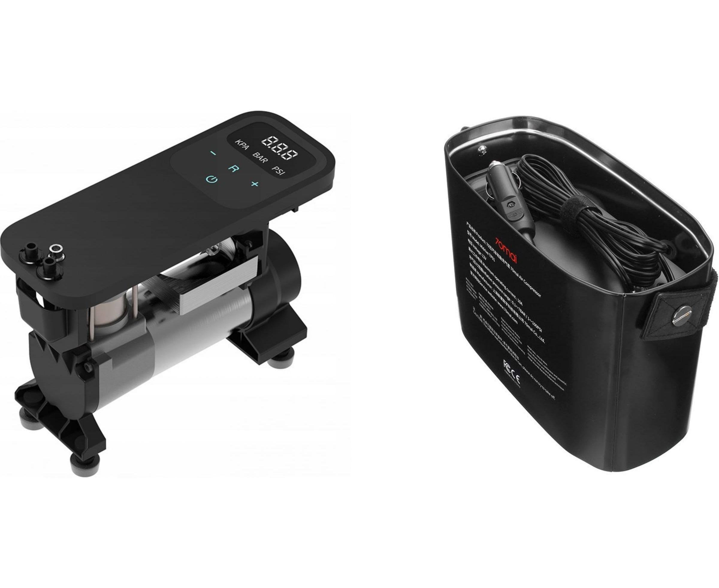 Компрессор имеет встроенные кабель питания с адаптером в прикуриватель и мягкий резиновый шланг.