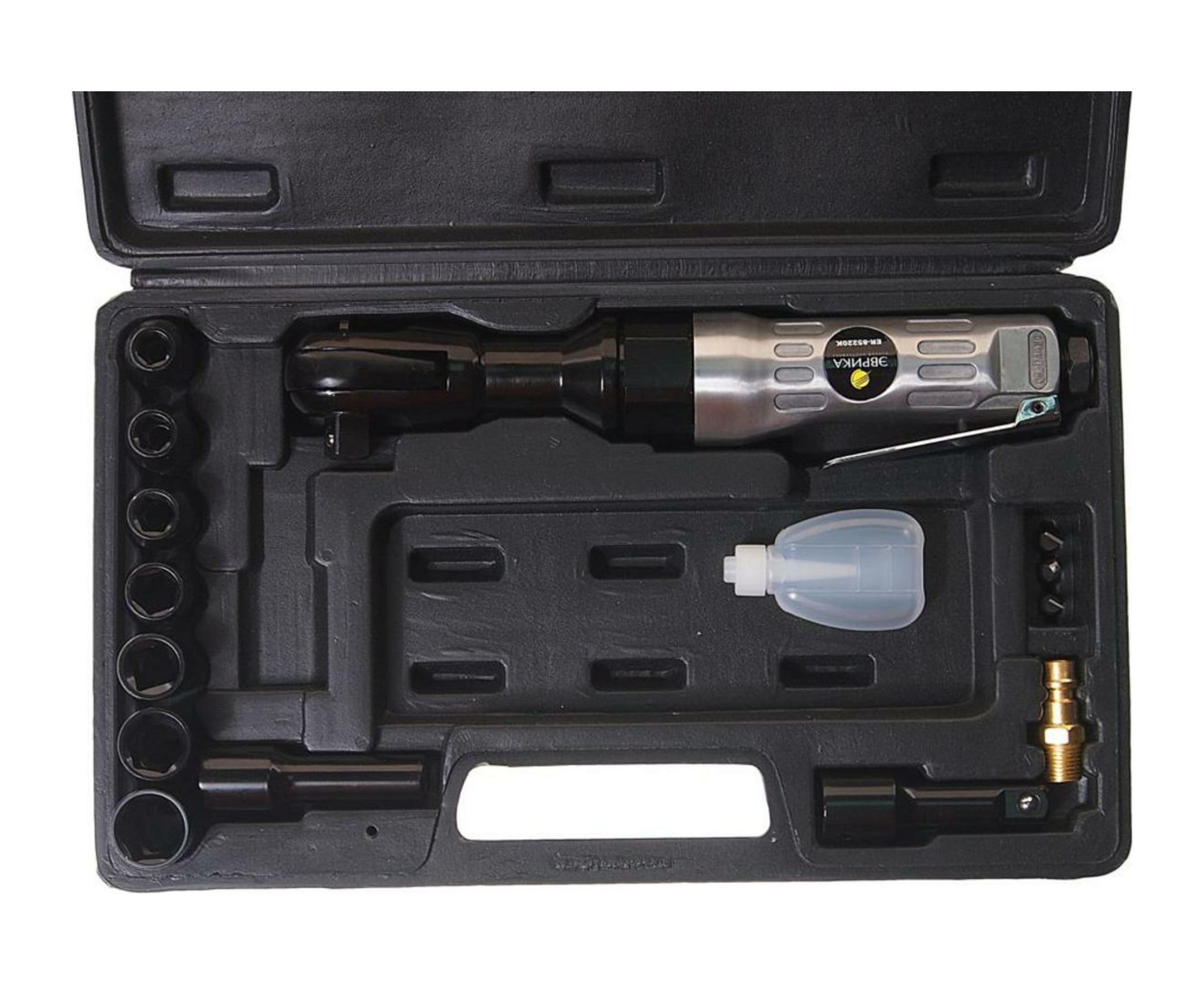 Пневмотрещотка ЭВРИКА с набором ударных головок 17 предметов 9-19мм ER-85220K используется для быстрого закручивания болтов, винтов и гаек.