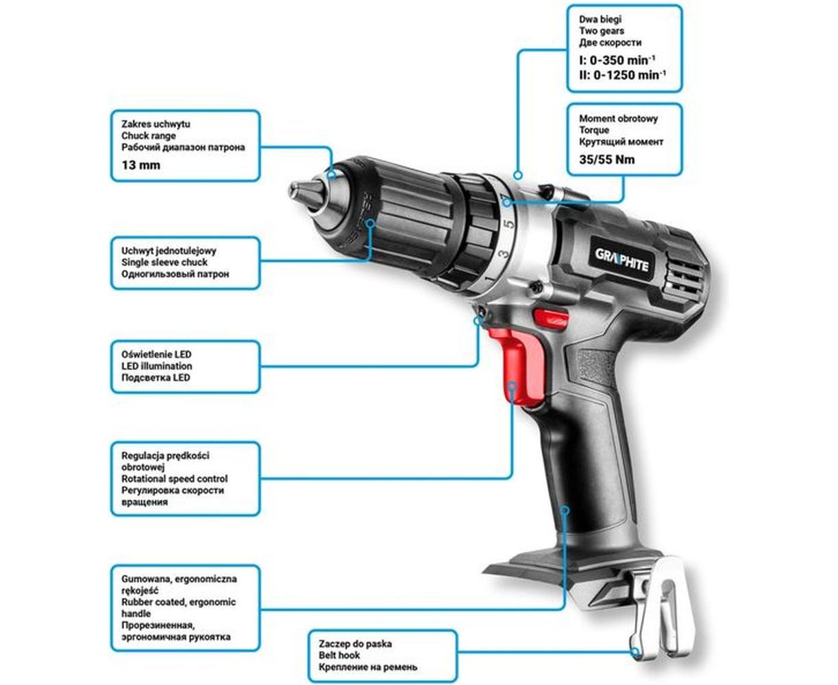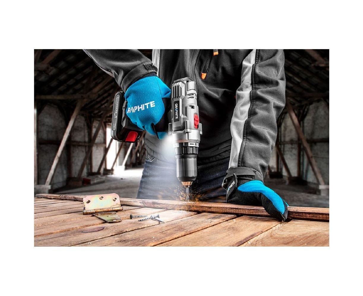 Аккумуляторная дрель-шуруповерт GRAPHITE Energy+ 58G006-SET2 обеспечивает качественное сверление отверстий, а также работу с крепежными элементами.