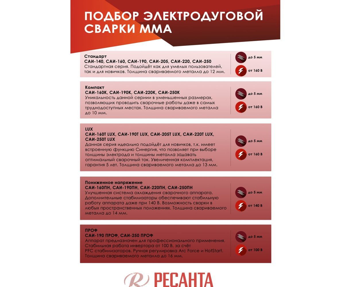 Отличным выбором для электродуговой сварки электродом с твёрдым основным и рутиловым покрытием может стать модель инверторного сварочного аппарата известного бренда Ресанта модификации САИ-250. Этот агрегат относится к категории полупрофессиональных моделей и отлично подходит для выполнения различных ремонтных работ, где требуется высокоточная сварка при небольшой мощности. Аппарат инверторного типа, поэтому обеспечивает довольно высокую производительность, стабильность функционирования при скачках сетевого напряжения и устойчивость дуги.
