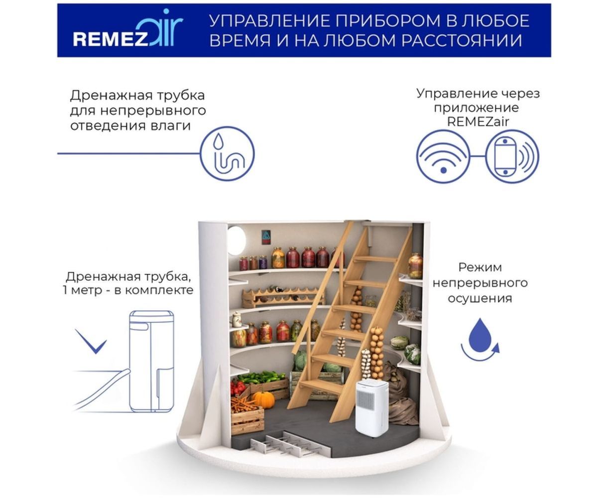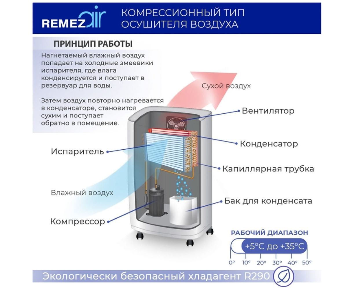 Осушитель воздуха Remezair RMD-301 ЦБ-00000240 эффективен для помещения площадью 40 кв.м., работает в режиме осушения и очистки воздуха, тем самым значительно улучшая микроклимат.