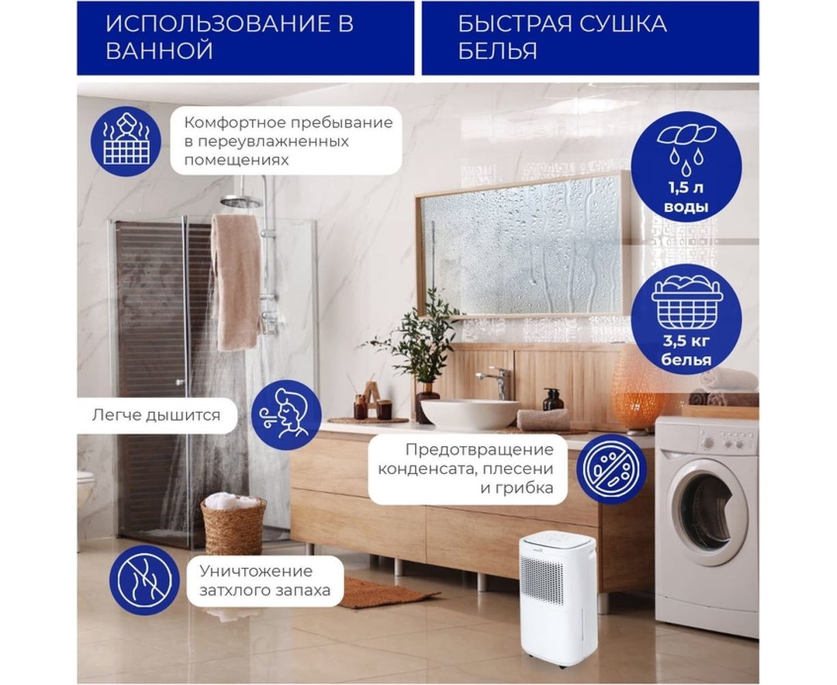 - Режимы осушения воздуха: стандартное, непрерывное, интенсивное, быстрая сушка белья.
