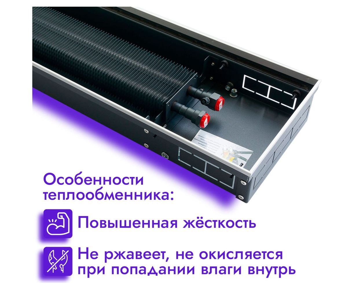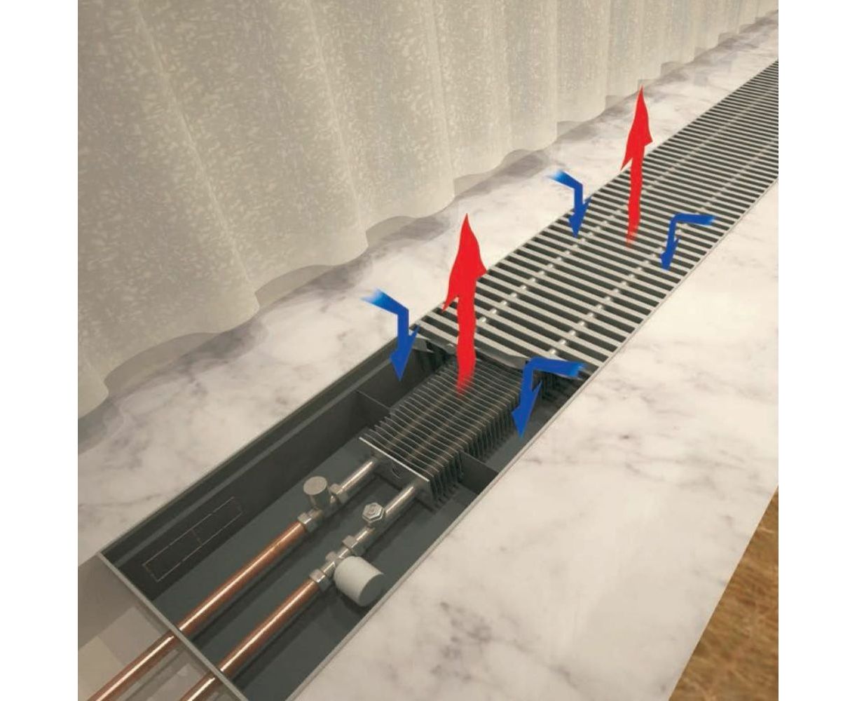 Прибор с малой высотой корпуса может быть установлен в неглубокий пол или подоконник. Встраиваемый конвектор полностью адаптирован для эксплуатации в российских системах центрального и автономного водяного отопления, может быть установлен как в однотрубную, так и в двухтрубную систему. Рекомендован для применения в системах отопления с принудительной циркуляцией.