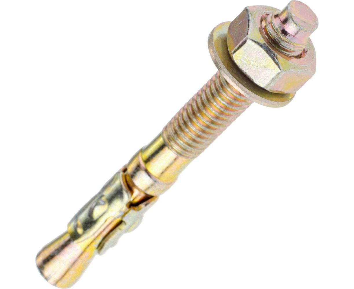 Клиновой анкер Rizzel 16x105 20шт. 353275 представляет собой крепежный элемент в виде шпильки с резьбой, на одном конце которой располагается шайба с гайкой, на другом - распорный узел с муфтой в форме конуса. Предназначен для крепления разнообразных конструкций к бетону, кирпичу или природному камню (полнотелым основаниям).