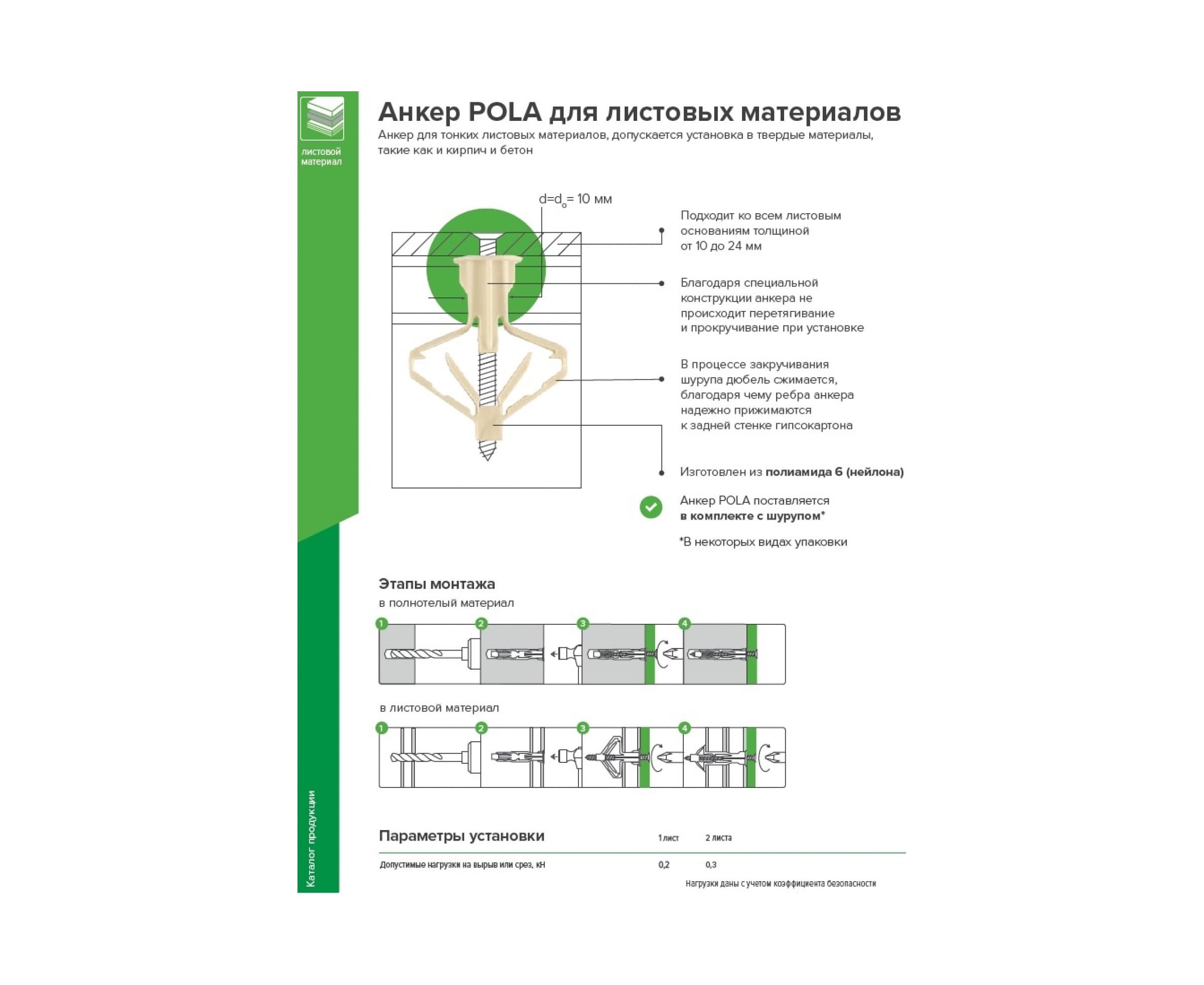 Дюбель (анкер) Партнер Pola нейлон 10x50 с шурупом 4 шт. 831850 изготовлен из нейлона и подходит ко всем листовым основаниям толщиной от 10 до 24 мм. Допускается установка в твердые материалы, такие как кирпич и бетон.