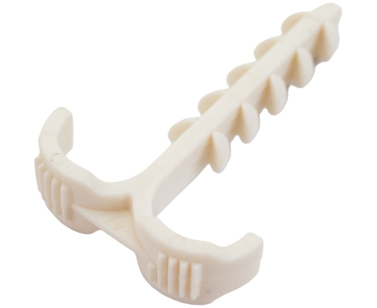 Дюбель-хомут Т-образный IEK изготовлен из полиамида 6.6 высокой прочности. Его особенная Т-образная форма сочетает в себе сразу два элемента: дюбель и скобу, что позволяет проложить 2 кабеля одновременно как вертикально, так и горизонтально. Одинаково эффективен при прокладке кабеля в кирпичных и блочных стенах, бетонных перекрытиях, потолках, полах и фундаментах. Это удобный, быстрый и экономически выгодный способ крепления кабеля при проведении электромонтажных работ.