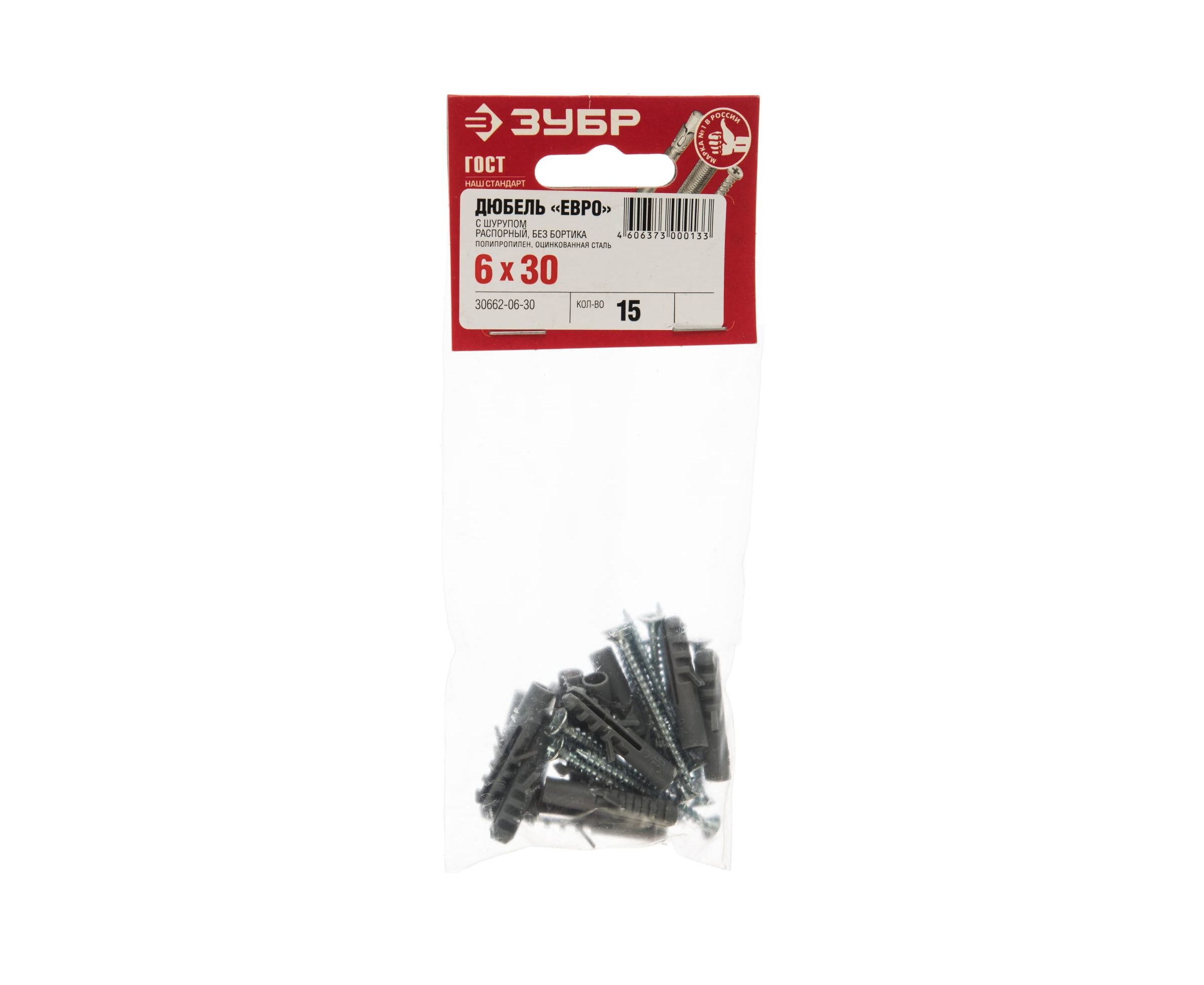 Дюбель 15 шт. с шурупом (6x30 мм) Евро Зубр 30662-06-30