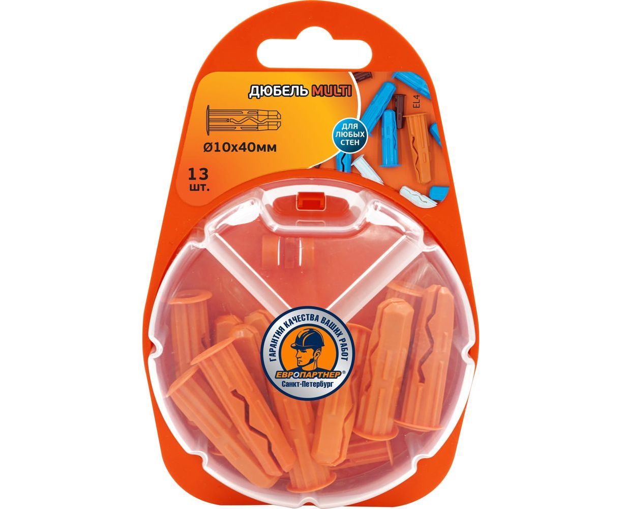 Дюбель ЕВРОПАРТНЕР MULTI plug 10x40 13 шт. RB2 0124 предназначен для любых оснований: бетон, кирпич, камень, гипсокартон, газобетон, пенобетон. Применяются любые крепежные элементы: шурупы, крюки, петли, винты, гвозди. Материал дюбеля: нейлон.