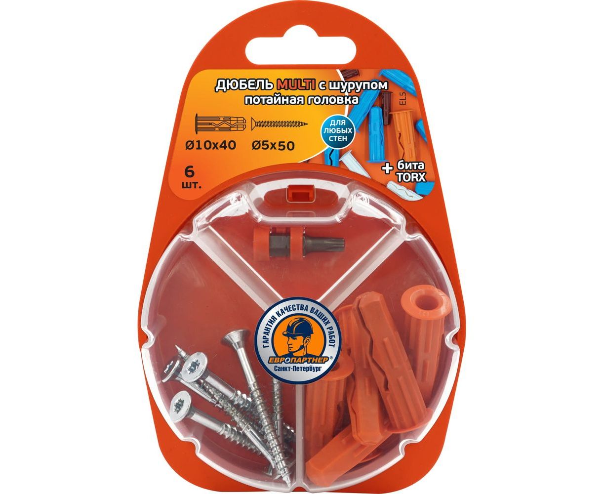 Дюбель ЕВРОПАРТНЕР MULTI plug 10x40 + шуруп MULTI универсальный, пот. головка, неполная резьба, ZN RB2 0142 применяется при креплении изделий в любое основание: бетон, пенобетон, газобетон, полнотелый и пустотелый кирпич, природный камень, гипсолитовая плита, гипсокартон. Комплектуется битой TORX и шурупами с потайной головой 5х50 мм.
