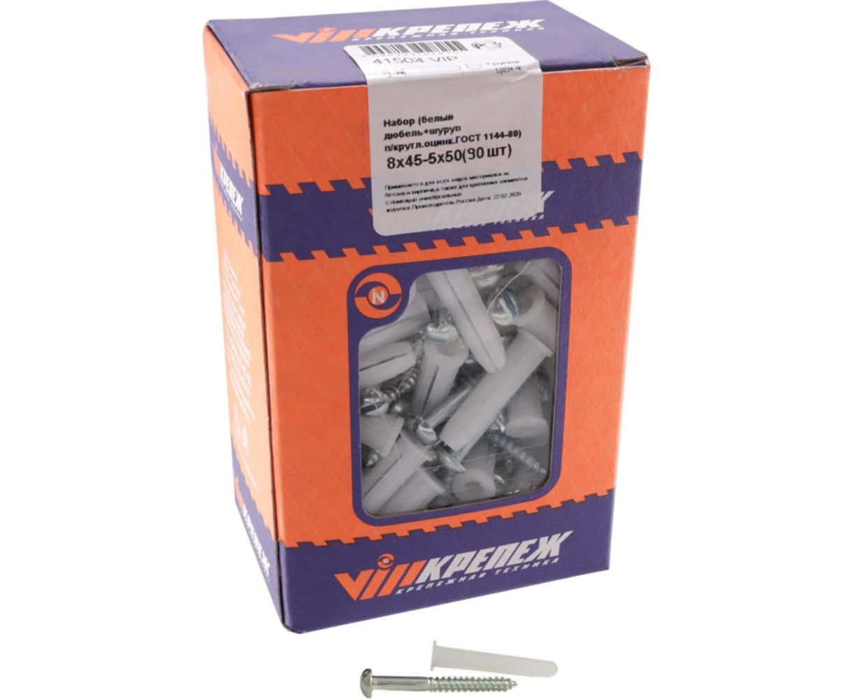 Набор VIPкрепеж белый дюбель 8х45 + шуруп 5х50 п/гол. оцинк. 90/90 шт 41504 VIP