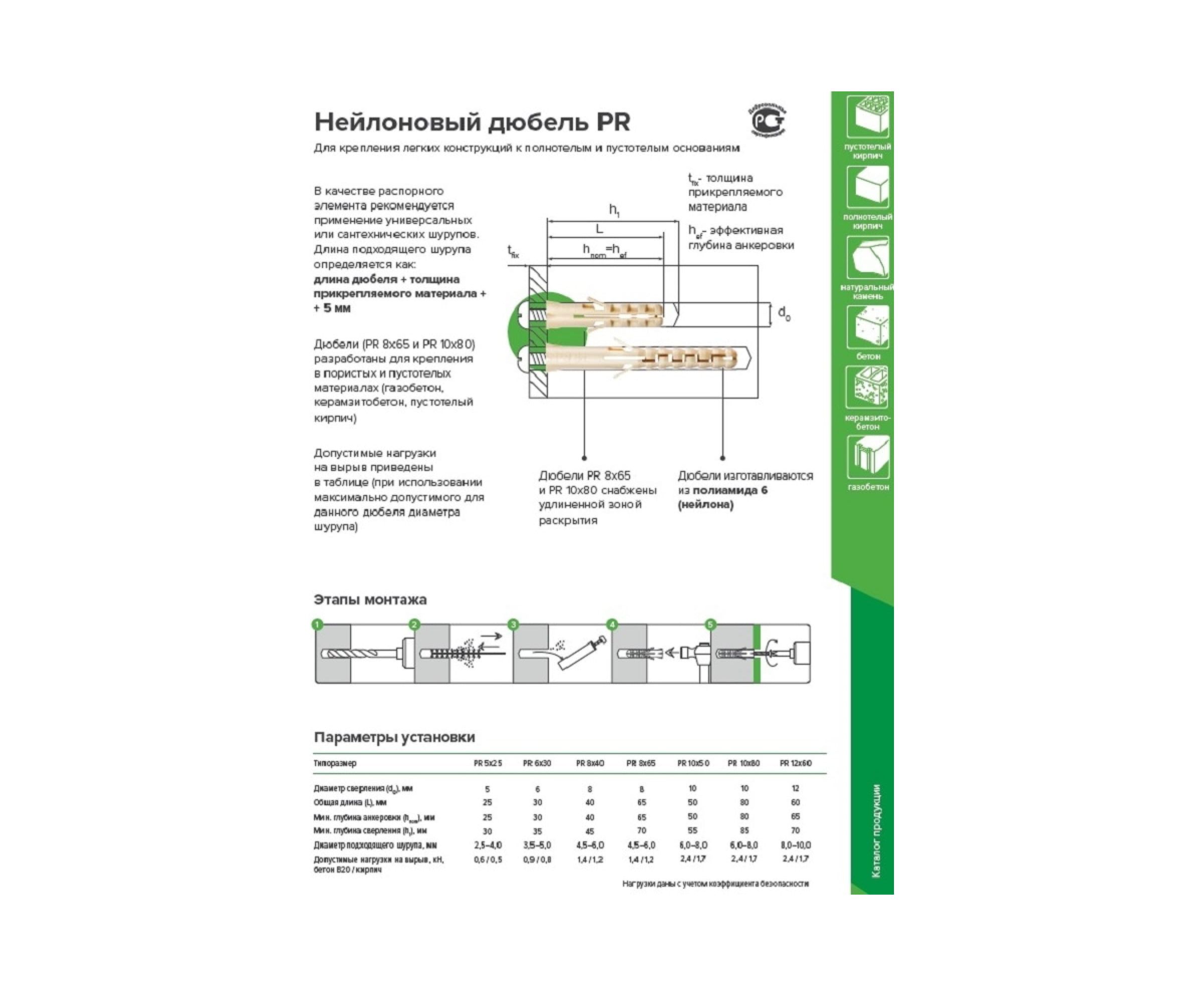 Нейлоновый дюбель Партнер PR 8x40 25 шт. 825624 предназначен для крепления легких конструкций к твердым материалам основания: бетон, натуральный камень, полнотелый кирпич. В качестве распорного элемента рекомендуется применение универсальных или сантехнических шурупов. Длина подходящего шурупа определяется как: длина дюбеля + толщина прикрепляемого материала + 5 мм. Дюбели изготавливаются из полиамида PA6 в светло-бежевом цвете.