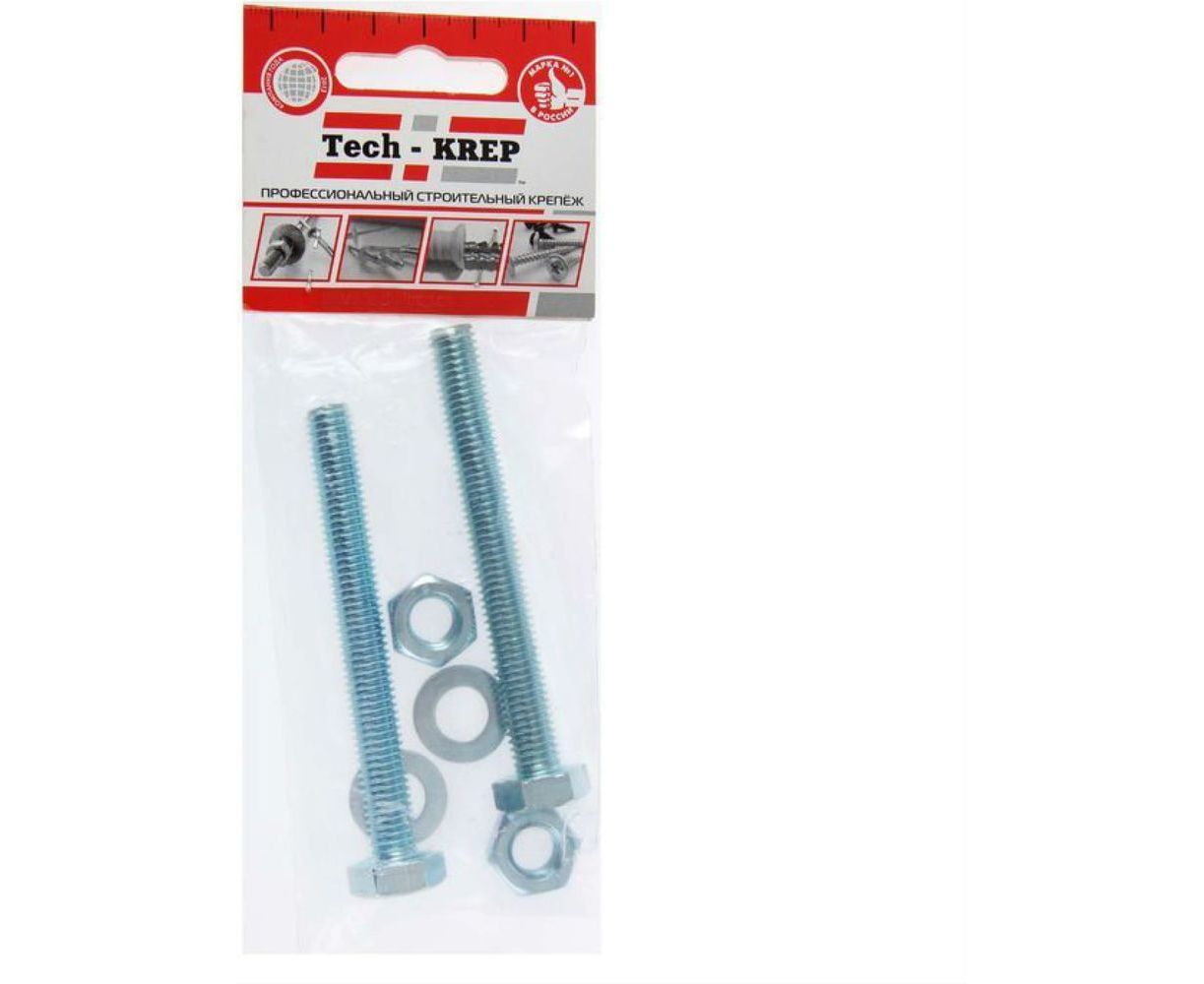 Болт Tech-Krep DIN933 с шестигранной головкой, оцинкованный М12х30 + гайка + шайба 2 шт - пакет 136921