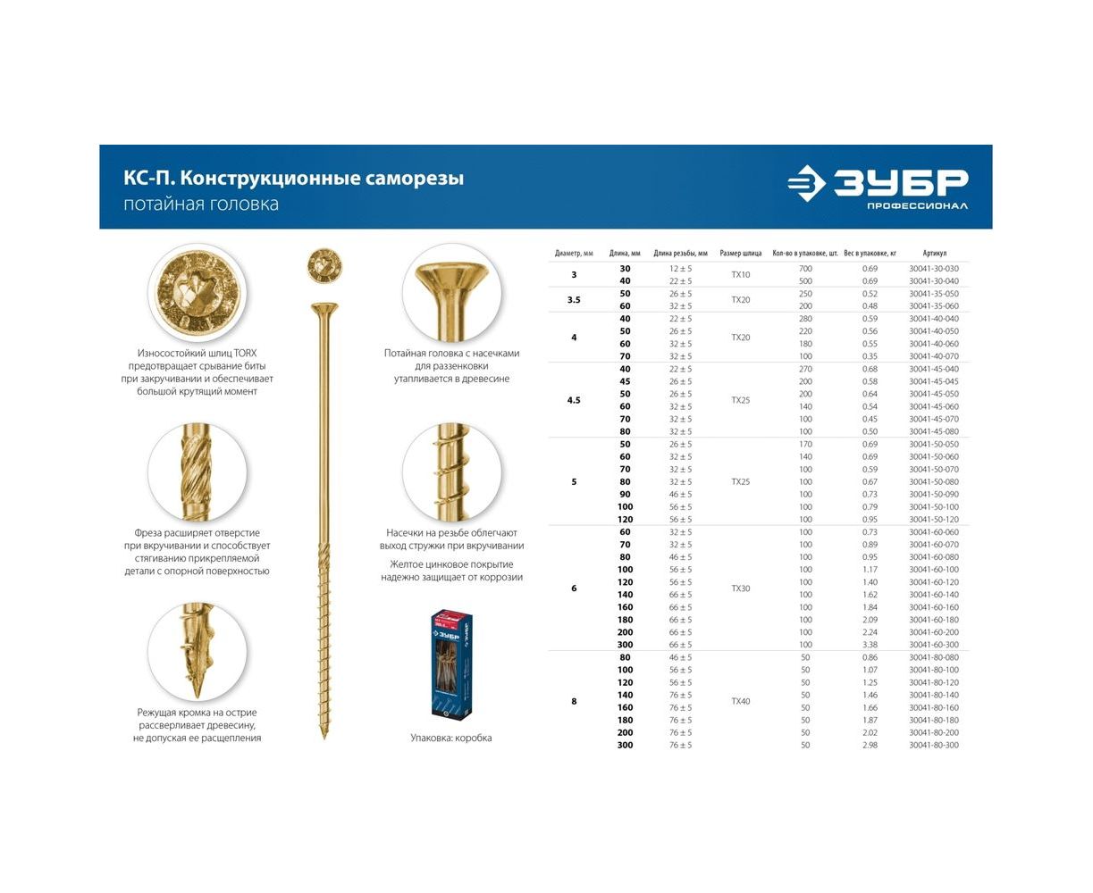 Конструкционные саморезы ЗУБР 30041-50-080, применяются в строительстве для создания надежного и прочного крепления различных конструкций. Обладают высокой прочностью и пластичностью, благодаря чему не разрушаются при деформациях и изгибе. Потайная головка с насечками для раззенковки утапливается в древесине. Фреза расширяет отверстие при вкручивании и способствует стягиванию прикрепляемой детали с опорной поверхностью. Износостойкий шлиц TORX предотвращает срывание биты при закручивании и обеспечивает большой крутящий момент. Насечки на резьбе облегчают выход стружки при вкручивании. Желтое цинковое покрытие надежно защищает от коррозии. Режущая кромка на острие рассверливает древесину, не допуская ее расщепления.