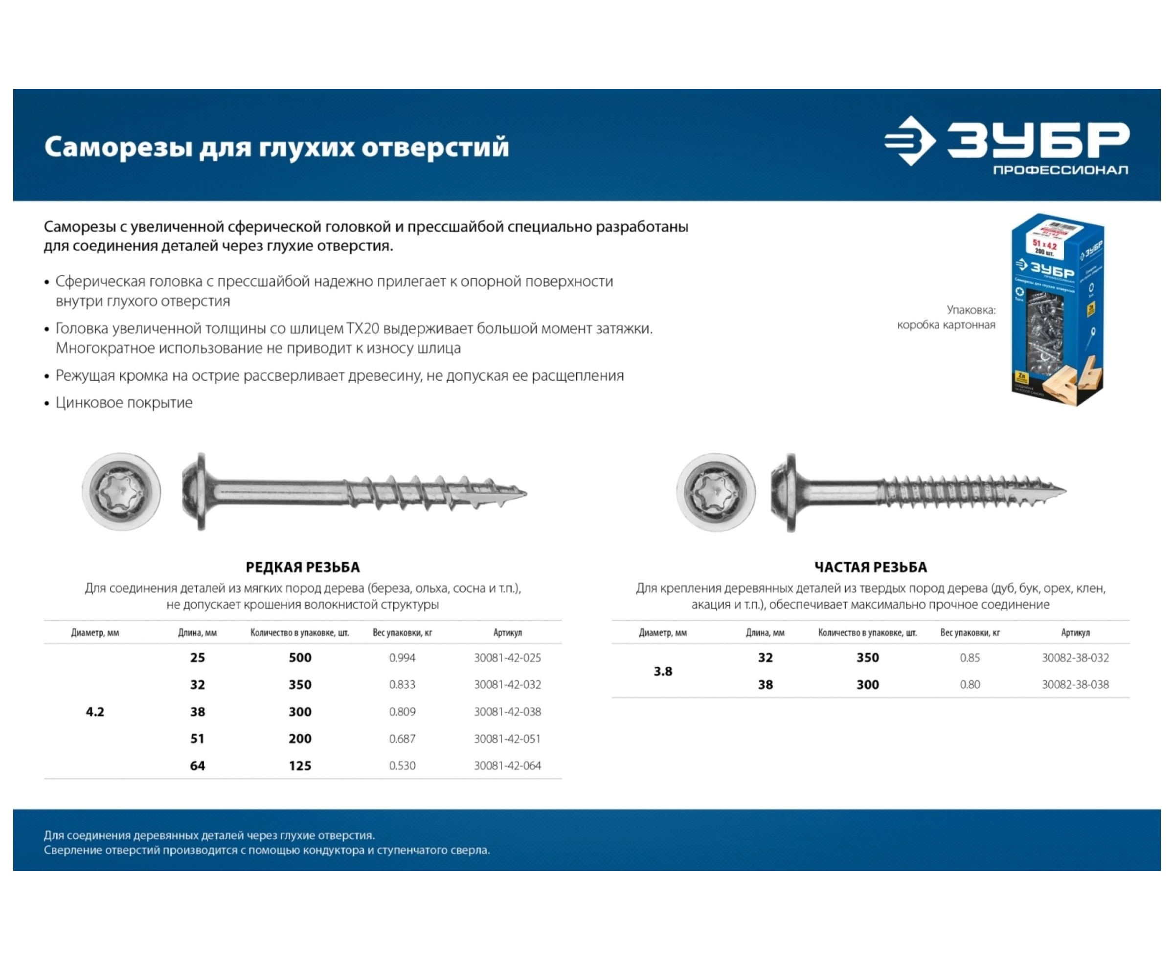 Саморезы для глухих отверстий ЗУБР Профессионал, редкая резьба, 38x4.2 мм, 300 шт. 30081-42-038