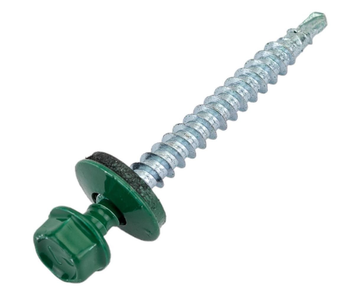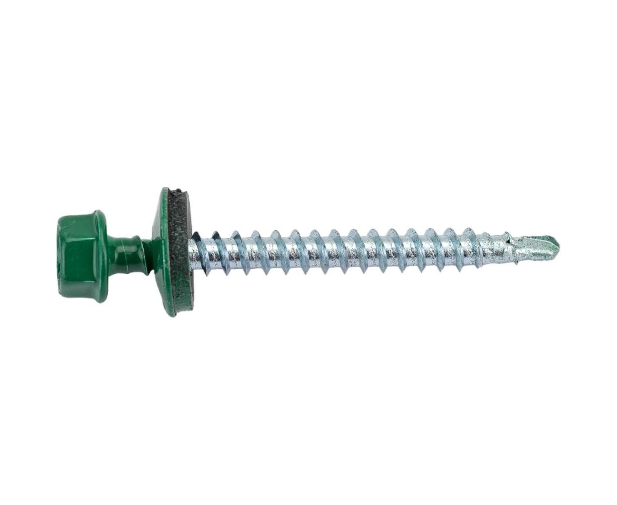Головка шестигранная с пресс–шайбой. Окраска-порошковое напыление по цветовым стандартам RAL. Толщина напыления 40 мкм. Саморез в сборе со стальной оцинкованной шайбой толщиной от 0,8 до 1,2 мм, с прокладкой из резины EPDM (мономер этилен–пропилен–диен) толщиной от 2,5 до 2,8 мм.
