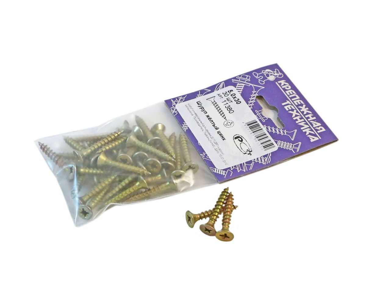 Шуруп крепежная техника желтый цинк, 5,0x30 30 шт. 11380 предназначен для сборки конструкций из дерева, фанеры, ДСП, ОСП и пр. Изделие произведено из стали Ст10, защищено от коррозии путем оцинковки поверхности.