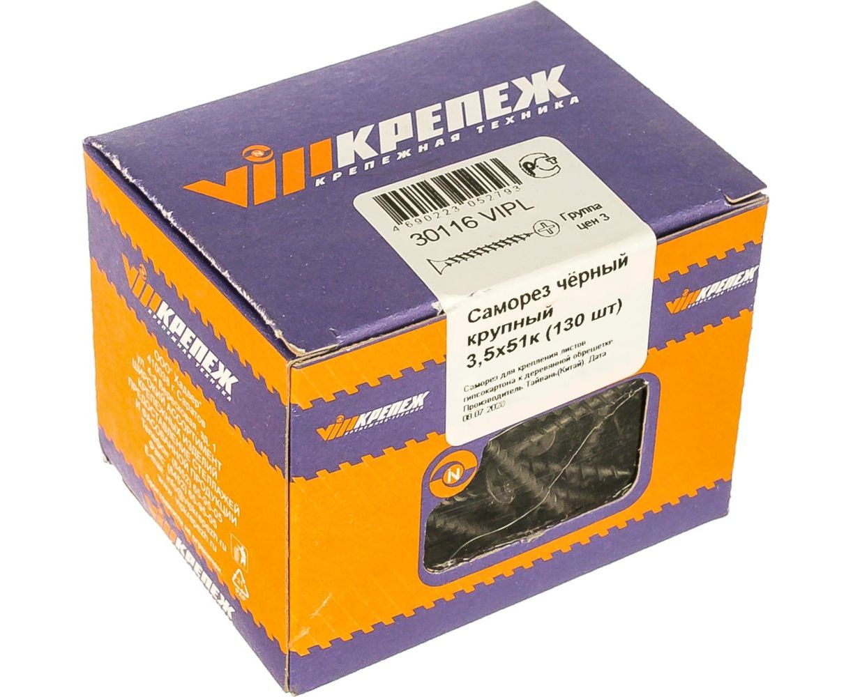 Саморез по дереву VIPКрепеж черный 3,5х51 к 130 шт 30116 VIPL имеет крупную резьбу и острый наконечник. Изделие применяется для фиксации отделочных материалов к основанию из дерева. Саморез изготовлен из стали марки Ст 10, покрыт оксидом, который защищает от коррозии.