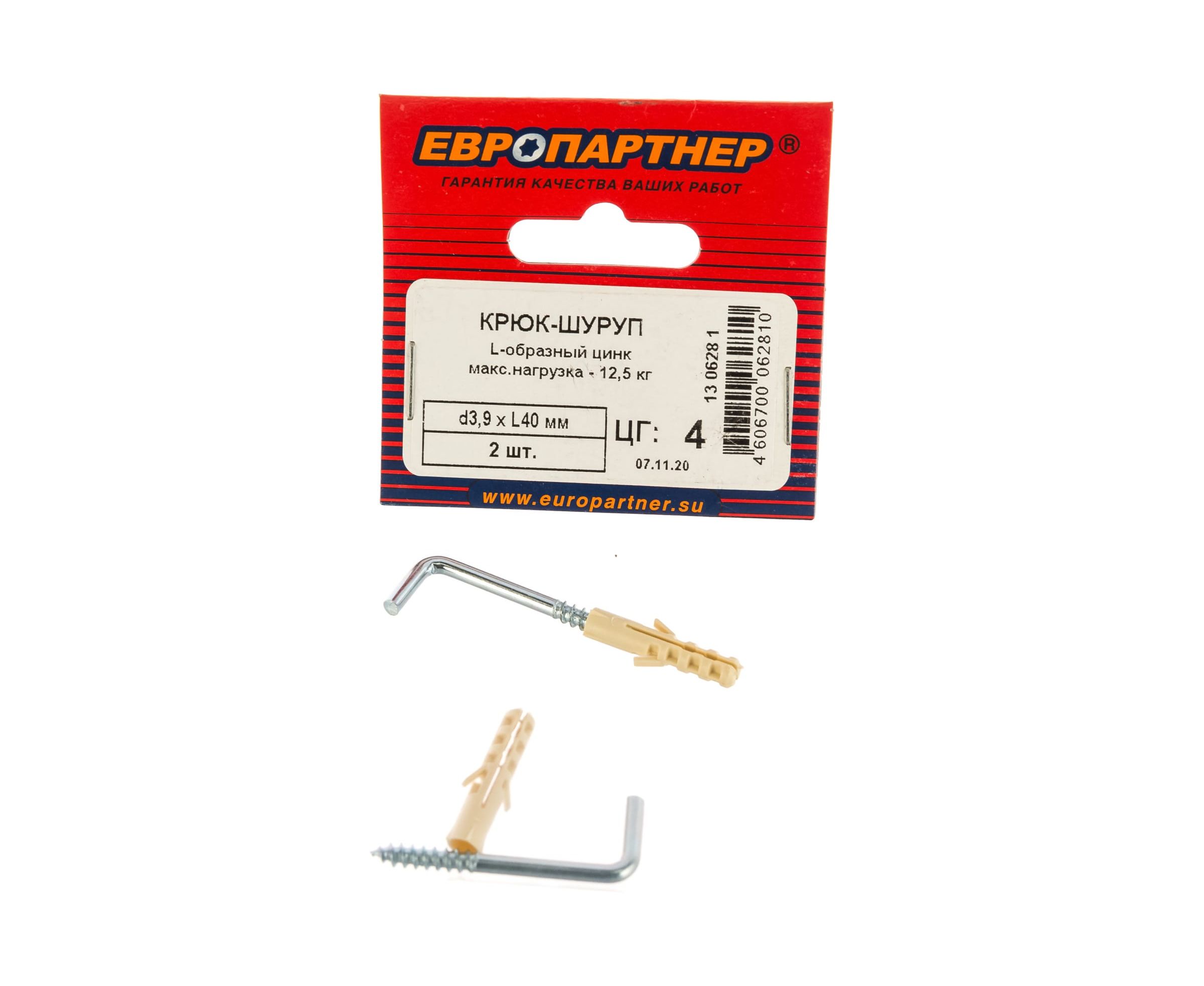 Крюк-шуруп ЕВРОПАРТНЕР L-обр. Zn d3,9хL40 мм 2 шт. 13 0628 1