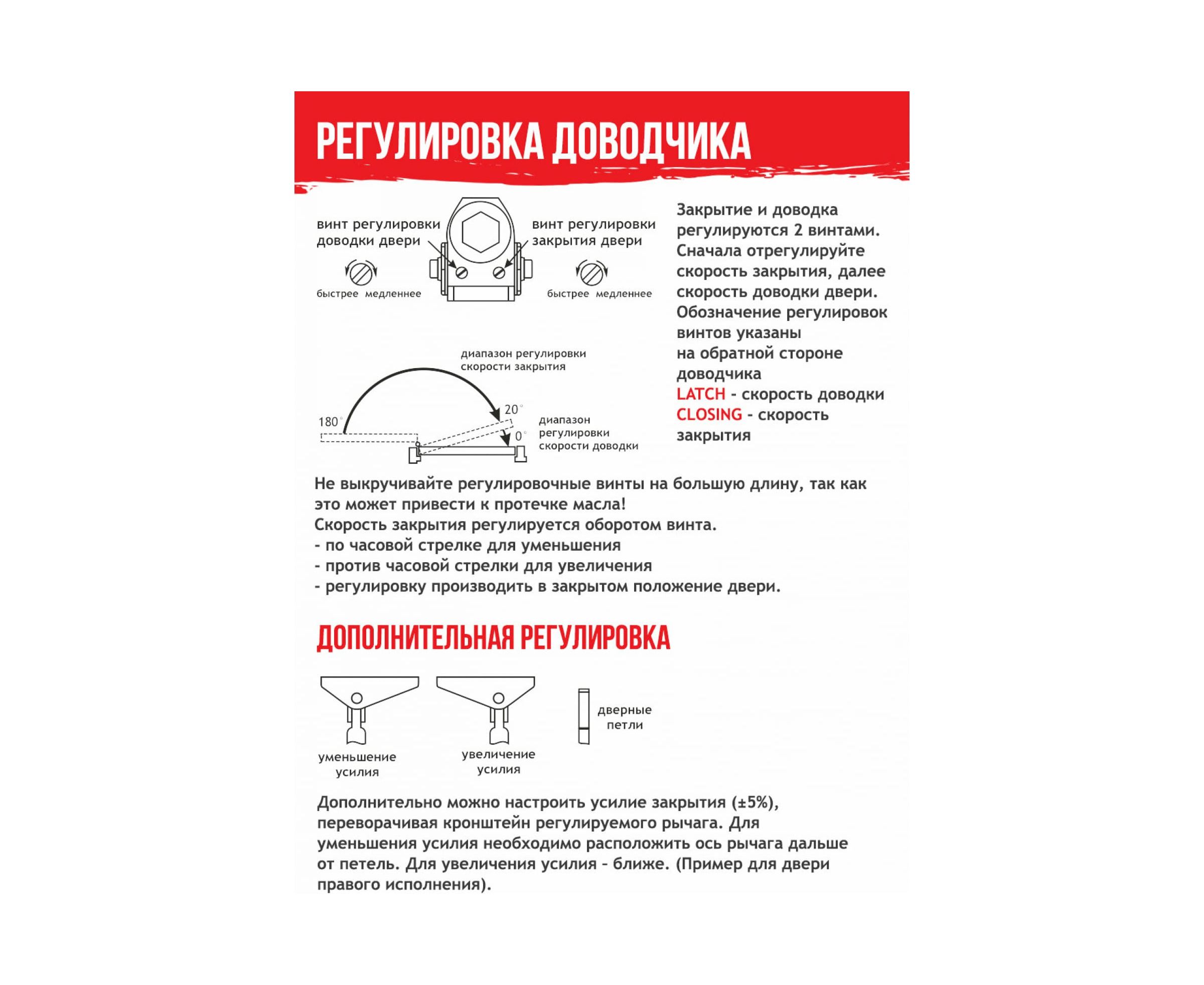 Доводчик универсален в использовании, его можно ставить как внутри помещения, так и на улице. В комплекте 2 вида крепежа, для установки на деревянные/пластиковые, либо на металлические двери. Полноразмерный шаблон для установки также в комплекте.
