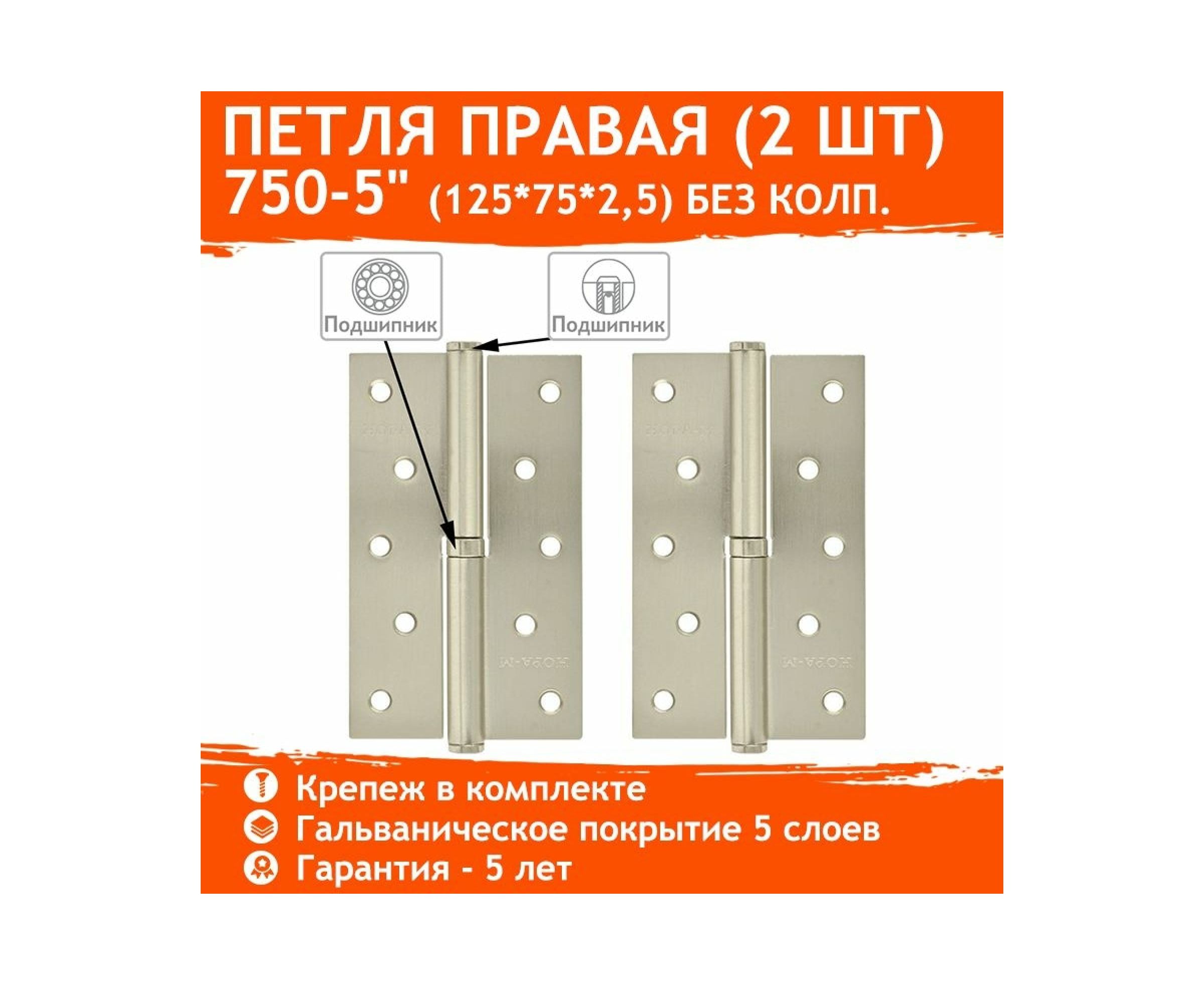 Петли дверные НОРА-М 750-5" мат. хром покр. правая 2,5 мм, №2 10598 предназначены для установки на деревянные межкомнатные двери правого открывания. Петли для дверей разъемные, что позволяет при необходимости легко снять дверь с петель. Петля карточная оснащена подшипниками скольжения и качения из закаленной стали, которые делают работу петель для дверей плавной, и исключают появление люфта в процессе эксплуатации.