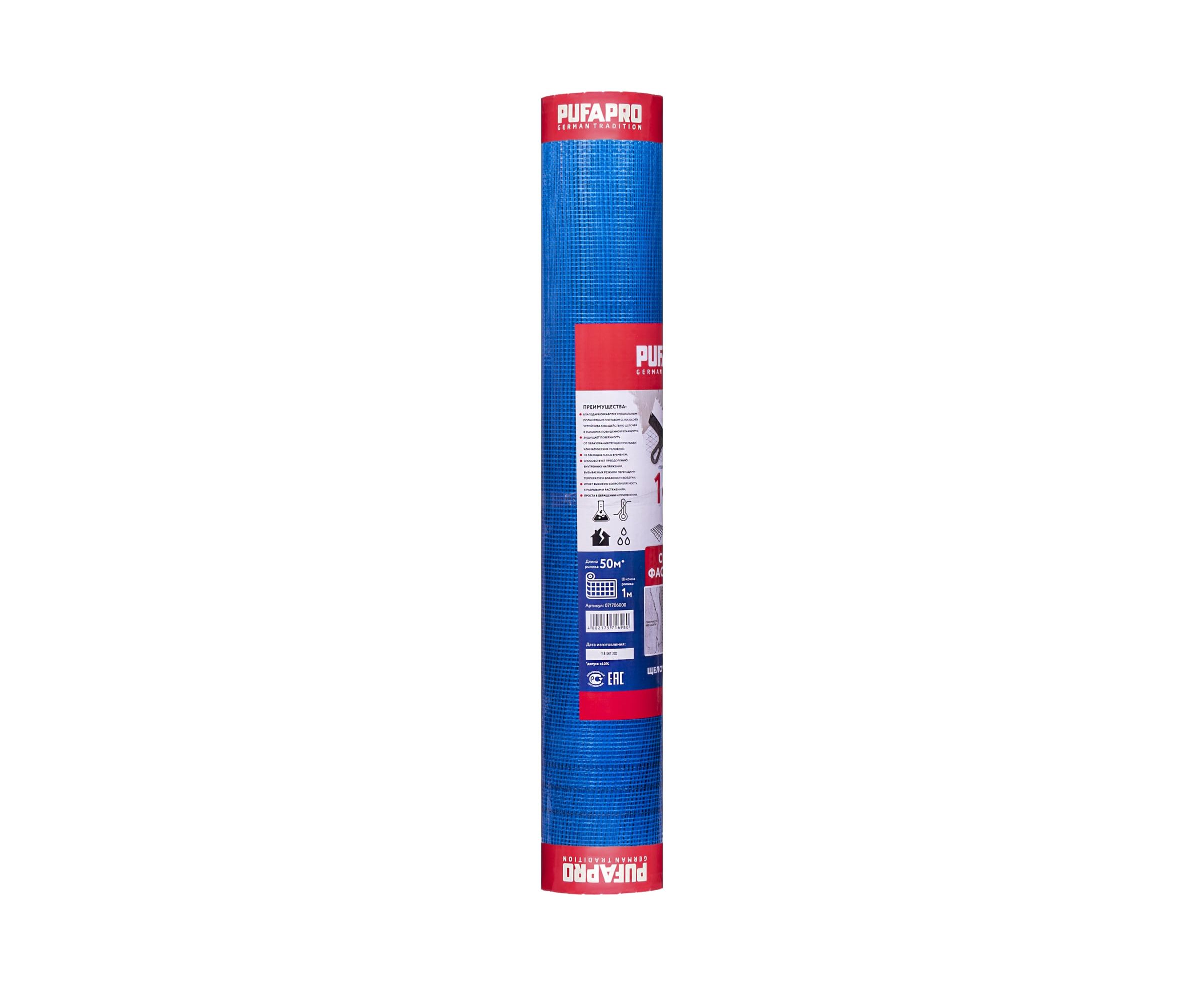 Фасадная стеклотканевая сетка PUFAPRO 5х5 мм, 160 г/кв.м, 1 м х 50 м, синяя М 71706000