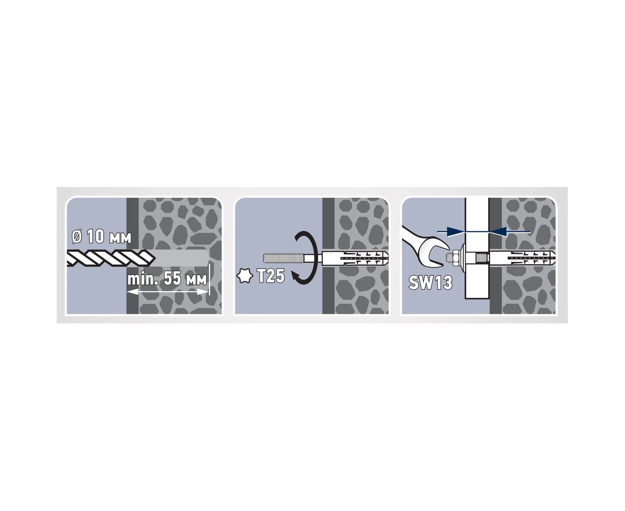 В комплекте PWR: нейлоновый дюбель, сантех. шпилька, оцинкованная гайка, оцинкованная шайба, гайка-втулка с эксцентриком + заглушка. Средняя часть шпильки имеет шестигранное сечение под ключ SW6. Торцевая часть имеет шлиц TORX T25. Глубина сверления 65 мм. Рекомендуемая нагрузка на вырыв, бетон - 150 кг. Максимальная толщина прикрепляемого материала 10-50 мм.